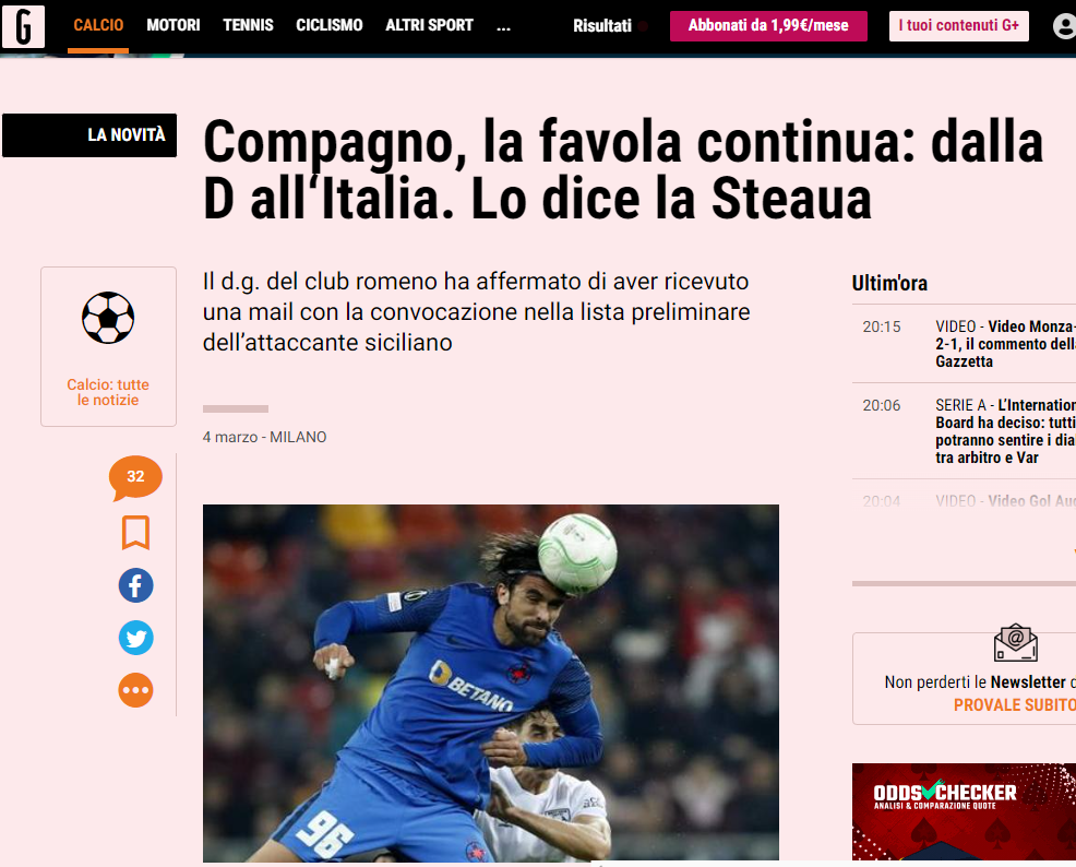 Gazzetta dello Sport l-a comparat pe ”bombardierul” Compagno cu uruguaianul Cavani.
