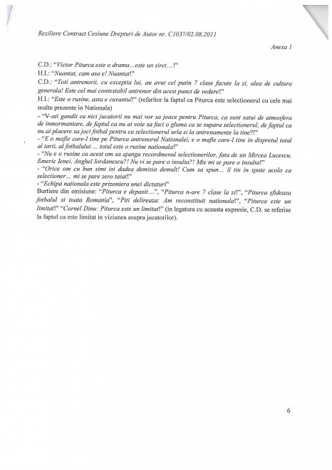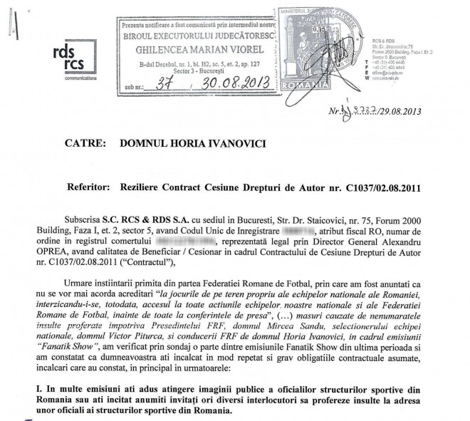 (Sarim peste gargara)...documentul oficial prin care lui Horia Ivanovici i s-a reziliat unilateral contractul cu televiziunea Digi Sport. Motivul principal invocat de RCS-RDS a constat în criticile dure pe care moderatorul le-a făcut în mod repetat de-a lungul timpului împotriva lui Mircea Sandu şi Victor Piţurcă.