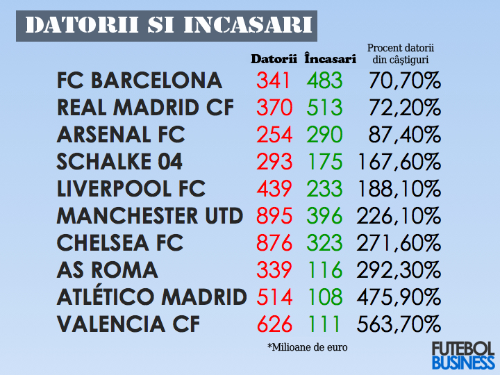 26-09-14 Sanctiuni UEFA pentru Fair play financiar!UEFA a anuntat oprirea platilor pentru doua cluburi din Romania! ASTRA si CFR Cluj sunt afectate de masura luata de UEFA. Motivul pentru care NU mai vin banii: “Fair play financiar”!Dupa investigatii, UEFA a sistat platile pentru cinci echipe care au concurat in sezonul 2014-2015 in competitiile europene. Este vorba despre CFR Cluj, Astra Giurgiu, Bursaspor, Buducnost si Ekranas. Doua cluburi romanesti din cinci !! Si e vorba de echipe care in perceptia publica au “bani” si investitori bogati. Cele cinci formatii au fost investigate de Corpul de Control Financiar al UEFA, care a ajuns la concluzia preliminara ca au datorii "catre alte cluburi, angajati sau taxe si impozite neplatite", inainte de 30 iunie 2014. Masura este una preliminara, iar UEFA a blocat banii pe care urma sa ii plateasca ca premii pentru parcursul in cupele europene de pana acum al formatiilor mentionate. Urmeaza cercetari in acest sens si o investigatie financiara mai amanuntita, anunta site-ul forului continental. Banii nu vor veni la cluburi pana la finalul anului in curs, in momentul in care se va face un nou control pentru a vedea daca platile sunt la zi. Cluburile mentionate au timp doar pana la 30 septembrie 2014 sa achite restantele catre stat, alte echipe si angajati, urmand sa faca dovada catre UEFA. In plus, Corpul de Control Financiar al UEFA a inceput investigatii preliminare, fara insa a lua masuri imediate - ca in cazurile de mai sus - si in ce priveste alte sapte cluburi: Liverpool, Monaco, Roma, Besiktas, Inter, FC Krasnodar si Sporting. Autoritatea europeana vrea sa clarifice datele care arata situatia deficitului financiar al celor sapte echipe de la finalul lui 2012 si 2013. In prezent sistarea platilor s-a facut doar la cele cinci echipe mentionate anterior, intre care si la CFR si Astra. In total sunt 115 cluburi monitorizate strict de Corpul de Control Financiar si care trebuie sa aduca dovezi ca stau bine in ceea ce priveste datoriile in termenii fixati de UEFA pentru aceasta toamna. Introducerea de catre UEFA a licentierii cluburilor si de regulamentului de Fair Play financiar a avut deja un impact pozitiv pe scara datoriilor restant. Pierderile cumulate raportate de cluburile de prima divizie din campionatele Europei, în exercitiul financiar 2013, au scazut pana la 800 milioane euro, de la un deficit raportat-record de 1,7 miliarde euro in 2011. Pe langa deficitul(pierderea) inregistrat din exerciciu financiar anual, cluburile au acumulat si datorii imense. Patru din cluburile cu cele mai mari datorii din fotbalul european sunt din Anglia, patru din Spania şi cate una din Germania şi Italia. Doua echipe engleze au cele mai mari datorii din Europa, cu sume care se apropie de un miliard de euro fiecare. Marii datornici si gradul lor de indatorare Marile cluburi europene de fotbal sunt si marii datornici, cu un grad de indatorare halucinant. Potrivit raportului dintre datorii si castiguri, un club spaniol are balanţa negativa cea mai ridicata. Este vorba de Valencia, care cu 111 milioane de euro venituri, nu acopera nici pe departe cele 626 milioane de euro datorii. In schimb, trei din echipele cu cele mai mari datorii, granzii spanioli Barcelona şi Real Madrid plus Arsenal Londra, au incasari mai mari decat cuantumul datoriilor. Clubul cu cea mai ridicata suma trecuta în dreptul datoriilor este Manchester United, cu 895 de milioane de euro, iar clubul care datoreaza cei mai puţini bani din Top 10 este Arsenal, cu 254 de milioane de euro. ![]() NOTA A nu se confunda “Datoriile” cu “Cheltuieli anuale”, care sunt opozatibile numai “Incasarilor anuale”. Pentru o mai buna intelegere o sa exemplific pentru FC Barcelona. In exercitiu financiar 2012-2013, clubul catalan a avut "Incasari" de 483 milioane euro si "Cheltuieli" de 447 milioane euro. Asta inseamna ca la sfarsitul anului 2013 a inregistrat un "Profit contabil" de 483 - 447 = 36 milioane euro si mai are o "Datorie" de 341 milioane euro. Simplificat, “Gradul de indatorare” reprezinta raportul dintre "Datorii" si "Venituri"(incasari). O limita sub 30% indica o rezerva in apelarea la credite si imprumuturi, iar peste 80% o dependenta de credite, situatie alarmanta. Din tabelul de mai sus se vede ca toate echipele din top 10 sunt alarmant dependente de credite, chiar in pragul insolventei daca creditorii invoca in instanta recuperarea restantelor sau opresc linia de creditare. Clubul FC Steaua Bucuresti, in 2012-2013 a inregistrat venit de aproape 37 milioane euro si mai are o datorie de numai 2,5 milioane euro. Dar veniturile au fost influentate covarsitor de accederea in grupele Champions League si vanzarea de jucatori. X Ray FCSTEAUA.RO este un site deschis, facut de suporteri, pentru suporteri. Asteptam articolele scrise de voi, daca aveti ceva de spus si credeti ca o puteti face intr-un articol, nu ezitati!