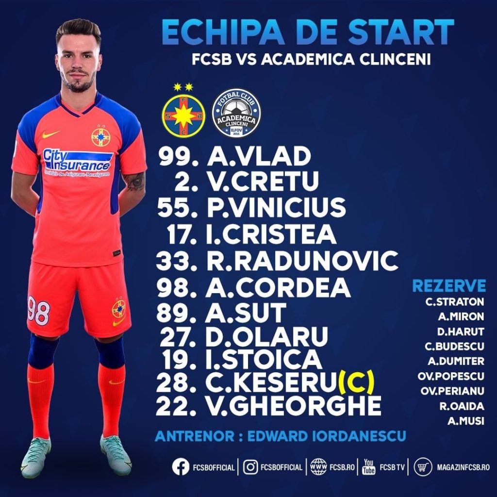 FCSB: A. Vlad – V. Crețu, Vinicius, I. Cristea, Radunovic – Cordea, Șut, Olaru – Ianis Stoica, Keșeru, V. Gheorghe