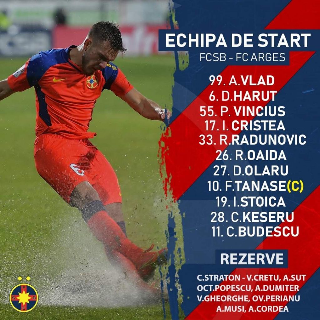 Vlad – Haruţ, Vinicius, Cristea, Radunovic – Olaru, Oaidă, Tănase – Stoica, Keşeru, Budescu
