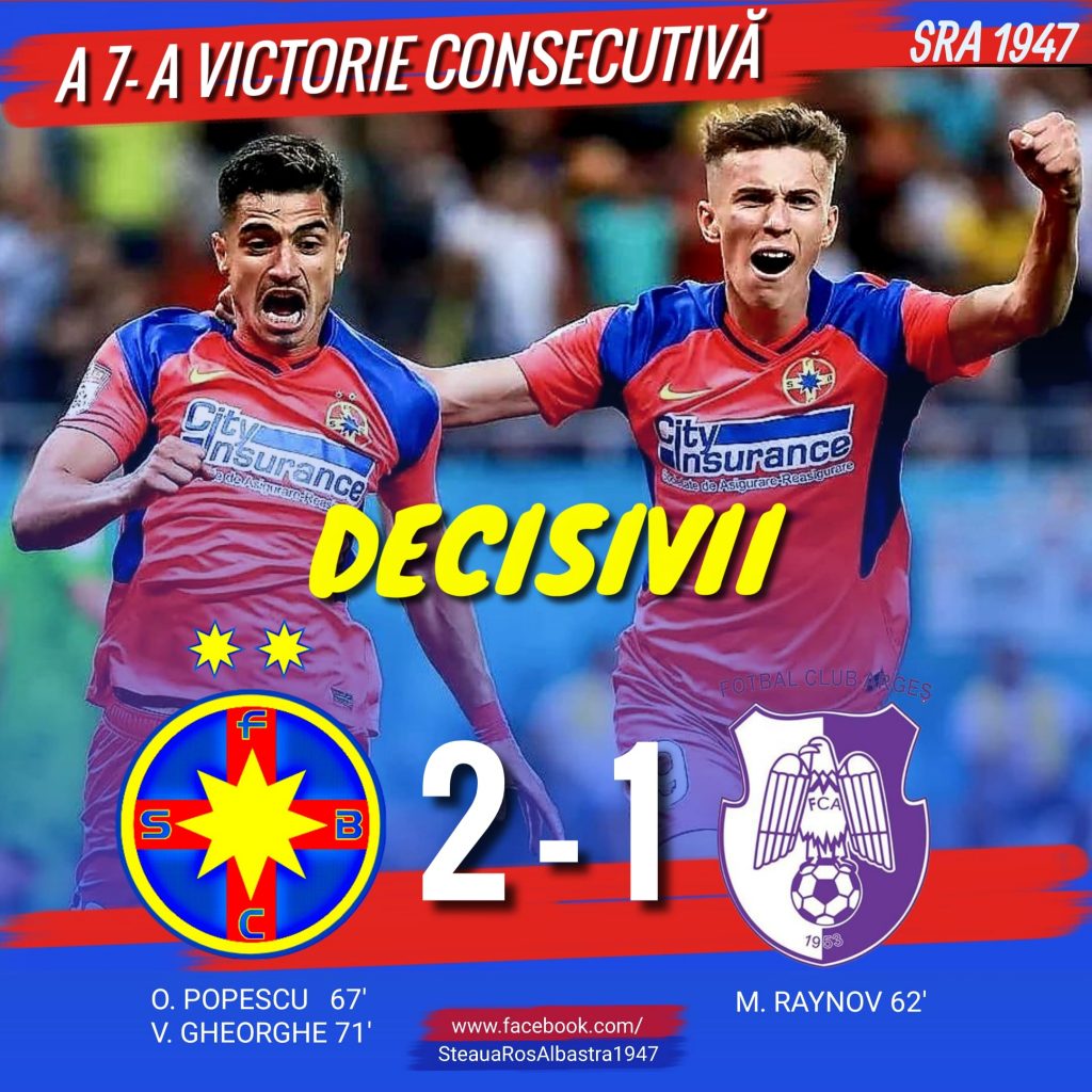Vicecampioana României învinge cu 2-1 pe FC Argeș, o echipă solidă și bine asezată în teren. A fost un meci dificil si din cauza marilor ratări comise de roș-albaștri, în frunte cu Ianis Soica. În loc să aibă cu 2 sau 3-0 pe tabelă, Steaua s-a văzut condusă în minutul 62 dintr-un corner. Însă Edi Iordănescu s-a dovedit inspirat la schimbări (60′). După numai 9 minute, roș-albaștrii au întors rezultatul prin „rezervele” Octavian Popescu (67′) și Valentin Gheorghe (71′), cel care a finalizat cu capul din pasa altei „rezerve”, Vali Crețu.