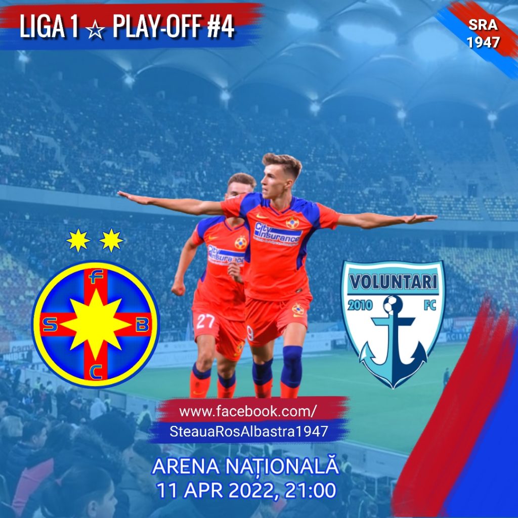 ⚽️?Luni, 11 aprilie 2022, cu începere la ora 21:00, se va juca pe Arena Națională partida dintre FC Steaua și FC Voluntari, ce contează pentru runda cu numărul 4 din play-off-ul Ligii 1. Disputa va putea fi urmărită în direct pe Digi Sport, Orange Sport și Look TV.