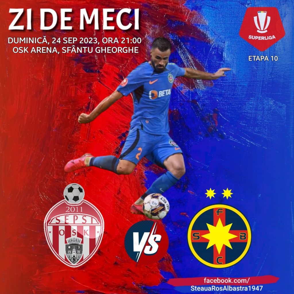 ⚽️?Meciul Sepsi OSK – FC Steaua se joacă duminică, 24.09.2023, de la ora 21:00 pe OSK Arena din Sfântu Gheorghe. Partida se dispută în cadrul etapei cu numărul 10 a Superligii de fotbal și va fi transmisă în direct la Orange Sport 1, Prima Sport 1 și Digi Sport 1.