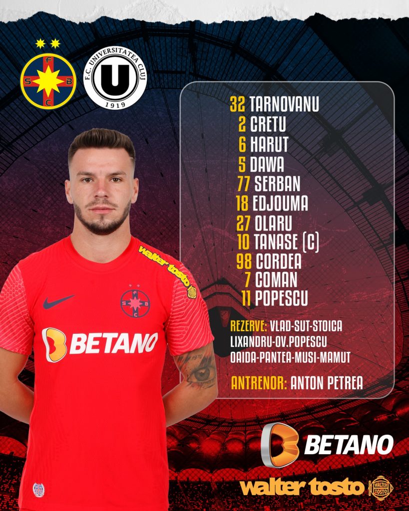 Ștefan Târnovanu – Vali Crețu, Denis Haruț, Joyskim Dawa, Risto Radunović – Darius Olaru, Adrian Șut, Octavian Popescu – Andrei Cordea, Florin Tănase, Florinel Coman.