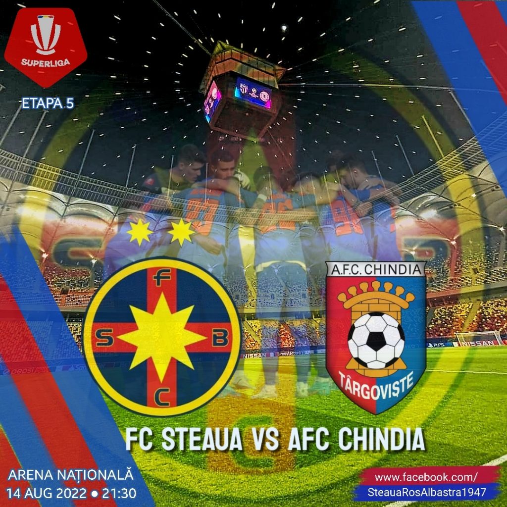 ⚽️?FC Steaua va juca în etapa cu numărul 5 a Superligii României împotriva celor de la Chindia Târgoviște, pe Arena Națională, duminică, 14 august 2022, de la ora 21:30.