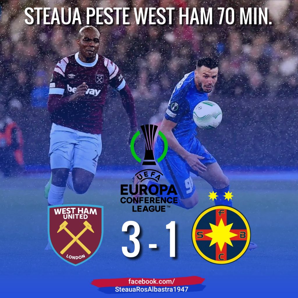 Penalty-ul a fost transformat de Jarrod Bowen, care a egalat pentru West Ham la primul șut pe poartă al echipei londoneze după 70 de minute de joc! Până în acel moment Steaua a trimis 3 șuturi pe spațiul porții și a marcat 1 gol prin Cordea (34′).