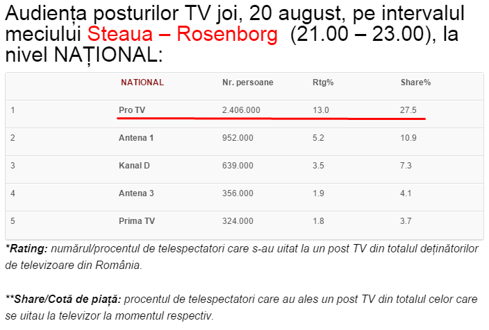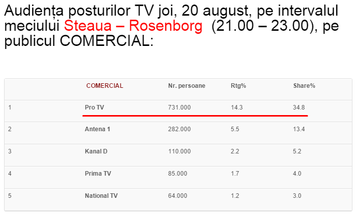 Paginademedia.ro vă prezintă în continuare audiențele partidei Steaua – Rosenborg: