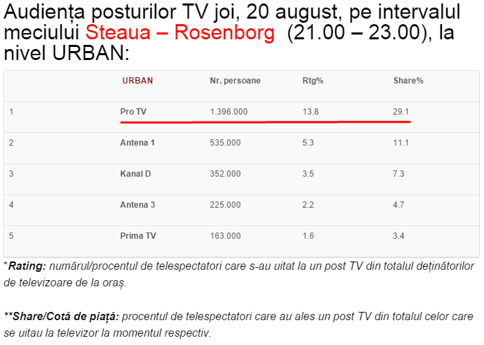 - URBAN. Din publicul partidei, aproape 1,5 milioane de telespectatori au fost din mediul urban. Antena 1 a avut pe interval, la orașe, jumătate de milion de telespectatori.