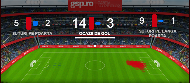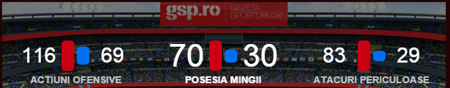 De cealaltă parte, oltenii nu au reuşit să pună în pericol real poarta lui Niţă, având un sigur corner abia în minutul 72, şi nu au mai contat deloc în joc după eliminarea lui Băluţă pentru o intrare dură la Adi Popa. Posesia campioanei de 70% demostrează că aspiranții craioveni la un loc în Play off au fost dominați copios.