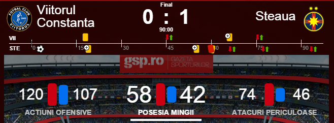 Viitorul – Steaua 0-1 (0-1), gol Hamroun in debut de joc. In ultimele 30 de minute, Steaua a jucat in inferioritate, dupa eliminarea lui Papp.