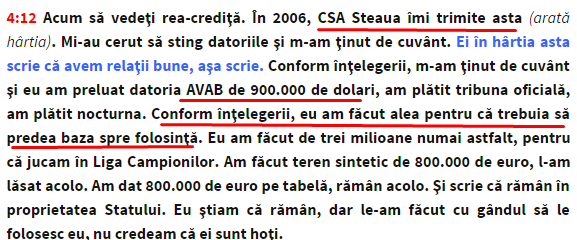 […] El a mintit cand a spus ca a investit milioane in stadion si baza de pregatire(atat de mult a investit incat stadionul e varza acum), a mintit cand a spus ca platea 30 de mii de euro pe luna, a mintit cam in tot ce a zis.