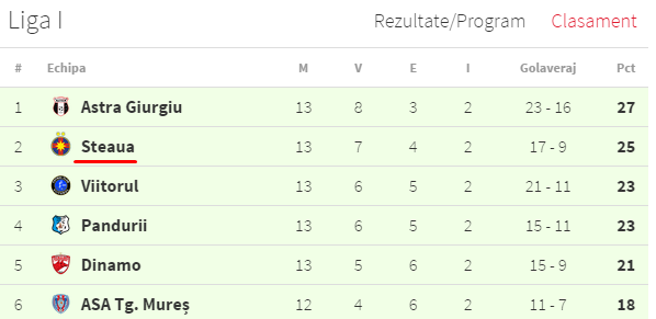 Campioana României este lidera morală a turului din sezonul regulat, dar ocupă locul 2 cu 25 puncte. În cel mai slab sezon din ultimii 3 ani, roș-albaștrii ar fi fost lideri cu 28 de puncte, dacă Sebastian Colțescu nu le „fura” victoria în partida cu Astra, anulând campioanei 3 goluri perfect valabile!!! Falsul lider Astra, ar fi avut doar 24 puncte și nu 27 câte are acum. În loc să fie Steaua cu 4 puncte în fața Astrei, Colțescu, cu un arbitraj unicat în istoria fotbalistică a României, a făcut dintr-un 2-3 un 2-0 și a adus campioana la 2 puncte în urma giurgiuvenilor.