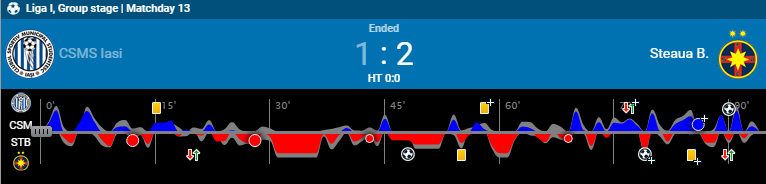 • Un penalty acordat steliştilor de către Cristi Balaj, însă după o consultare cu unul dintre asistenţi decizia a fost întoarsă şi s-a acordat offside, corect.  (min. 32)