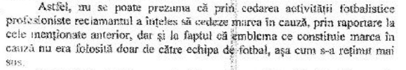 - pagina 19 „Astfel, nu se poate prezuma ca prin cedarea activitatii fotbalistice profesioniste reclamantul a înteles sa cedeze marca în cauza, prin raportare la cele mentionate anterior, dar si la faptul ca emblema ce constituie marca în cauza nu era folosita doar de catre echipa de fotbal …”
