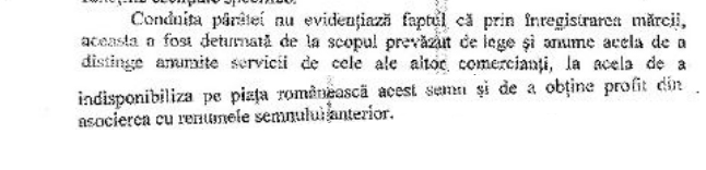 - pagina 7 „Conduita pârâtei nu evidentiaza faptul ca prin înregistrarea marcii, aceasta a fost deturnata de la scopul prevazut de lege si anume acela de a distinge anumite servicii”