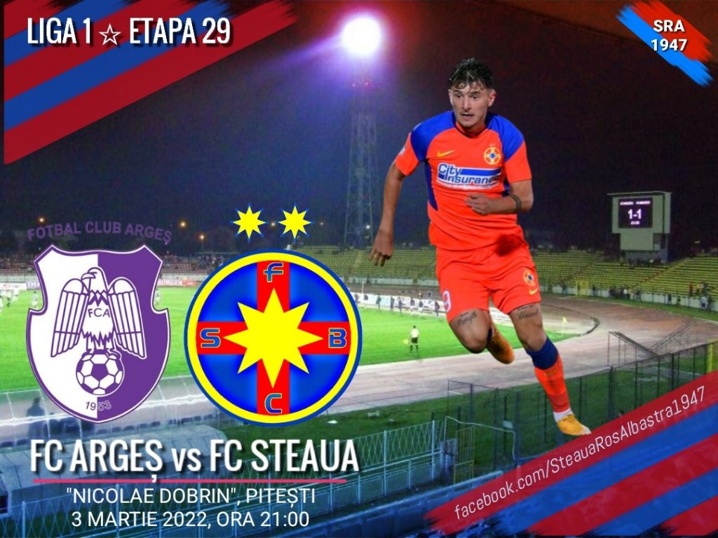 ⚽️?Joi seara, de la ora 21:00, în cadrul etapei 29 din Liga 1, FC Steaua se va deplasa la Pitești, acolo unde va da piept cu FC Argeș pe Stadionul „Nicolae Dobrin”.