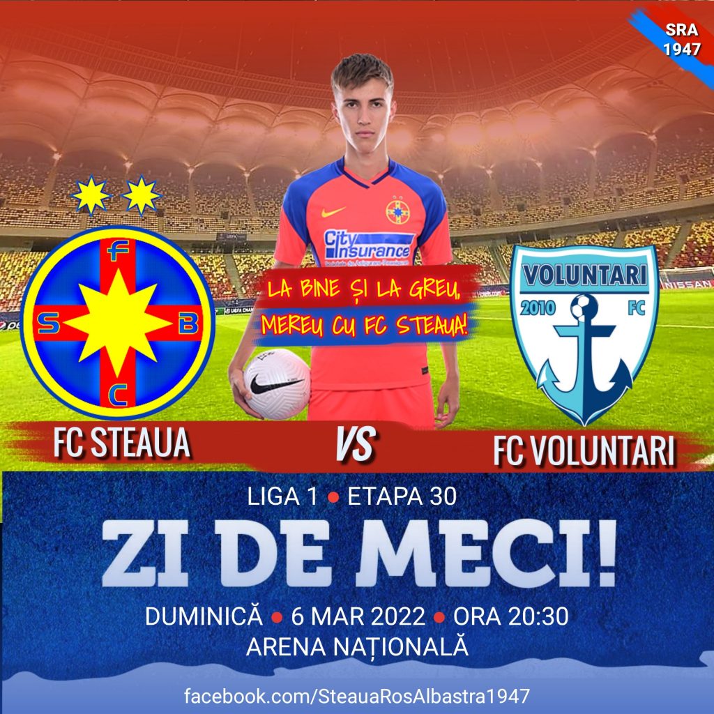⚽️?FC Steaua încheie sezonul regular (etapa 30) printr-un joc pe Arena Națională împotriva revelației acestui campionat, FC Voluntari. Partida se dispută duminică, 6 martie 2022, de la ora 20:30 și se anunță a fi una spectaculoasă, având în vedere că ambele formații au asigurată calificarea în Play-off.