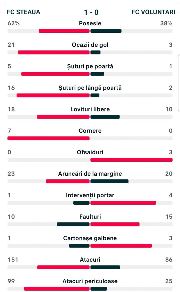O partidă dominată cap-coadă de roș-albaștri și jucată la o singură poartă. Elevii lui Toni Petrea i-au ținut cu fundul în poartă pe cei de la FC Voluntari din primul până în ultimul minut de joc.