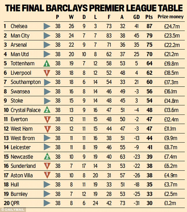 Chelsea a încasat £24.7m numai din câștigarea titlului. Man City a primit £23.5m , Arsenal £22.2m, Man United £21.2m, iar Tottenham £19.8m. Hull, Burnley si QPR, cluburile care au retrogradat, au incasat intre £3.7m – £1.2m.