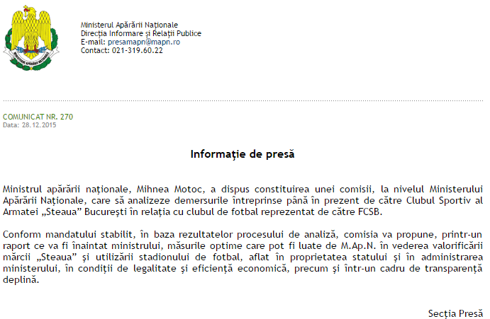 MApN anunță prin intermediul unui comunicat oficial postat pe site, că la nivelul Ministerului se va inființa o comisie care să analizeze „demersurile întreprinse până în prezent de către clubul Sportiv al Armatei în relația cu clubul de fotbal reprezentat de către FCSB”.