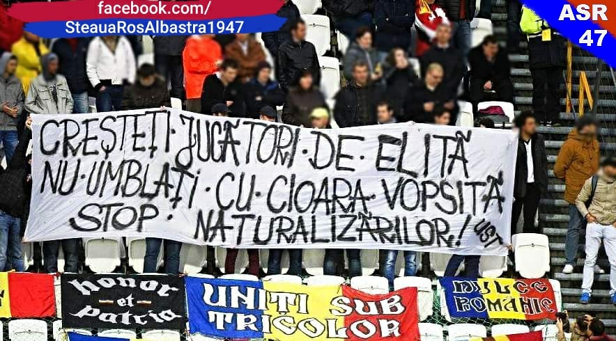 Suporterii au afișat mesajul „E <> (n.r. joc de cuvinte cu numele lui Mario Camora) să investim în juniori / Nu în importuri surogat din alte țări”, apoi au scandat „Centre de copii și juniori, nu import de jucători” și „Vrem națională cu sânge românesc, sânge românesc, sânge românesc”.