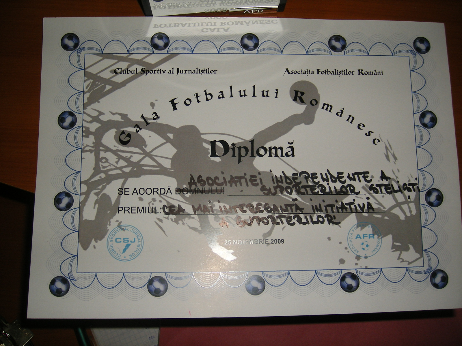 AISS, premiata la Gala Fotbalului RomanescAsociaţia Independentă a Suporterilor Stelişti a fost premiată miercuri, 25 noiembrie 2009, în cadrul celei de-a XIII-a ediţii a Galei Fotbalului Românesc, pentru cea mai interesantă iniţiativă a suporterilor din acest an.Astfel, organizatorii evenimentului, Clubul Sportiv al Jurnaliştilor şi Asociaţia Fotbaliştilor Români, au dorit să îşi arate aprecierea faţă de AISS pentru modul în care a comunicat cu presa în legătură cu protestele contra finanţatorului echipei Steaua, Gigi Becali, şi pentru faptul că a invitat întotdeauna la evitarea folosirii violenţei pe stadioane. Iată că, în ciuda faptului că şefii vremelnici din Ghencea consideră că nu au un partener de discuţie, din ce în ce mai mulţi oameni implicaţi activ în lumea sportului admiră eforturile Asociaţiei Independente a Suporterilor Stelişti de a apăra valorile celui mai galonat club din istoria fotbalului românesc: sportivitate, cinste, onoare, corectitudine, demnitate, profesionalism, competitivitate, dorinţa de performanţă. Deşi Asociaţia a fost înfiinţată în urmă cu aproximativ trei ani, reamintim că AISS a avut şi alte realizări de răsunet: aniversarea a 60 de ani de la înfiinţarea clubului - eveniment la care au luat parte peste 1.000 de persoane, printre care Gheorghe Hagi, Gabi Balint, Ilie Dumitrescu, Mirel Rădoi sau Alina Dumitru, am contribuit la realizarea primei coregrafii din deplasare a unei galerii româneşti într-un meci de cupele europene - la partida cu Slavia Praga, din data de 19 septembrie 2007, în acelaşi an i-am susţinut pe hocheiştii noştri într-o finală de Cupa României la Miercurea Ciuc, am organizat sărbătorirea a 61 de ani de la înfiinţarea clubului - eveniment la care au luat parte, prin alţii, Ilie Savu, Vasile Stângă sau Viorel Mazilu, şi, poate acţiunea care a avut cel mai mare impact în presa românească şi în inimile fanilor, protestul "62 - Ne Vrem Clubul Înapoi", un strigăt de revoltă, la aniversarea a 62 de ani de la înfiinţarea Stelei, împotriva a tot ce se întâmplă în acest moment în cadrul unicului club românesc de fotbal care se poate lăuda cu o echipă de aur şi cu una de argint în competiţiile europene intercluburi. Am dori să le mulţumim tutoror celor care ne-au susţinut, începând cu membrii noştri onorifici, Miodrag Belodedici, Ilie Savu, Vasile Stângă, Viorel Mazilu şi Mihai Găinuşă, continuând cu alte foste mari glorii care au luat atitudine împotriva comportamentului incalificabil al finanţatorului Gigi Becali, şi ne gândim la Gheorghe Hagi, Gabi Balint, Anghel Iordănescu, Marcel Răducanu sau Ladislau Boloni. Nu în ultimul rând, mulţumim şi tuturor suporterilor care ne-au fost alături în această perioadă dificilă. Vă asigurăm că AISS îşi va respecta şi în continuare valorile - sportivitate, cinste, onoare, corectitudine, demnitate, profesionalism, competitivitate, dorinţa de performanţă - acesta fiind şi cel mai important motiv pentru care nu vom înceta protestele la adresa actualei conduceri a clubului Steaua. Asociaţia Independentă a Suporterilor Stelişti |