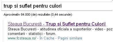 Trup si suflet pentru culori, noul slogan al FC SteauaFC STEAUA BUCURESTI prezinta astazi, in premiera, sloganul clubului. Acesta este "TRUP SI SUFLET PENTRU CULORI" si reprezinta spiritul clubului ros albastru, fiind preluat dupa cunoscutul cantec al suporterilor stelisti.Sloganul clubului nostru reprezinta devotamentul jucatorilor fata de club si suporteri, profesionalismul, corectitudinea, ambitia de a castiga mereu, dorinta de a fi langa echipa la bine si la greu. "TRUP SI SUFLET PENTRU CULORI" este esenta efortului urias facut de jucatori in atatea si atatea meciuri in care si-au apropiat victoria, incepand cu jocurile cu Dinamo si continuand cu celebra semifinala cu Anderlecht, cu finala Cupei Campionilor Europeni castigata la Sevilla sau cu Supercupa Europei. Pentru inegalabilii suporteri stelisti, sloganul lansat azi este echivalent cu prezenta alaturi de idolii lor in toate deplasarile dar si pe stadionul Ghencea, in soare, ploaie, viscol sau zapada, cel mai elocvent exemplu fiind meciul cu Villareal, din Cupa UEFA, amanat din cauza viscolului, la care fanii ros-albastri au creat o atmosfera nemaiintalnita pe stadioanele din Romania, fara sa le pese de ger sau ninsoare. Acesta este spiritul Stelei care se regaseste perfect in sloganul prezentat astazi. "TRUP SI SUFLET PENTRU CULORI" este o marca inregistrata la OSIM si va fi prezenta incepand cu acest sezon pe spatele emblemei ros-albastre de pe tricoul oficial de joc, in dreptul inimii, pe biletele de acces in stadion, pe abonamente, legitimatii de serviciu, legitimatii de acces, carti de vizita, mape de prezentare, plicuri, coli cu antet, site-ul oficial al clubului si pe panourile de la conferintele de presa, zona mixta si flash interviu. In curand va fi lansata si o gama de materiale promotionale cu sloganul clubului nostru, "TRUP SI SUFLET PENTRU CULORI". SteauaFC.com Nota redactiei: Clubul sustine ca sloganul a fost preluat dupa un celebru cantec stelist, ceea ce este partial adevarat. Oare doar de acolo s-au inspirat ? Va dam un hint: ![]() FCSTEAUA.RO este un site deschis, facut de suporteri, pentru suporteri. Asteptam articolele scrise de voi, daca aveti ceva de spus si credeti ca o puteti face intr-un articol, nu ezitati!