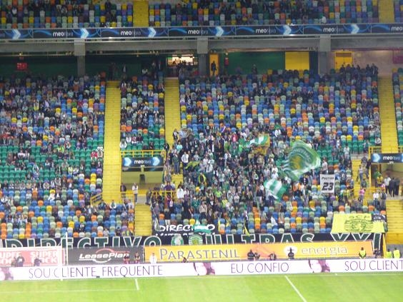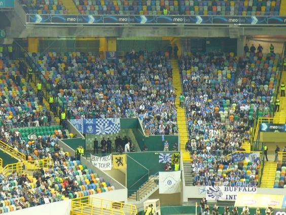 Stadionul este dezamagitor de gol probabil vreo 10.000 de fani. Juventude Leonina, una dintre cele mai vechi brigazi ultra, in activitate din 1976, are partea leului. Ei domina fondul vocal. Desi nu sunt foarte multi la meci, canta bine si sunt ajtati si de acustica stadionului acoperit. Tonul la cantece este dat printr-o statie, la fel cum facea Jean pe vremuri la derbiuri. Cantecele sunt variate, multe similare cu ale noastre mi-a placut varianta lor a lui Mike Oldfield - Moonlight Shadow, am putea sa-l utilizam si noi. Directivo ultras XXI sunt un fel de Peluza Sud, aflati de partea opusa a peluzei. Mai putini la numar, au un nivel sonor bun si partcipa in tandem la multe cantece cu cei de la Leonina. Mai este si o brigada aflata sub una din tabele, Torcida, care in afara steagurilor mari nu mi-a atras atentia sub nici un fel. Cei de la Gent au facut deplasarea in numar mare, peste 1000 dar nu s-au auzit nici o secunda. N-au iesit in evidenta prin nimic.