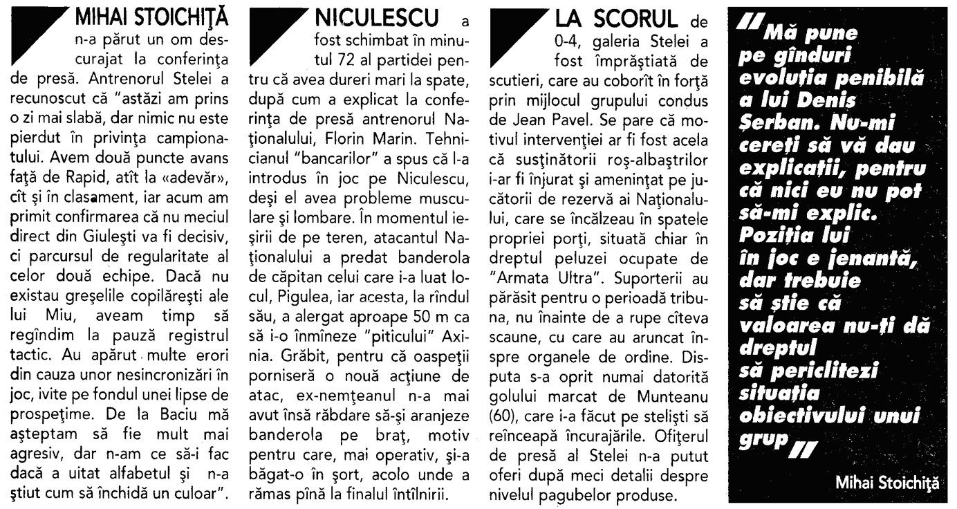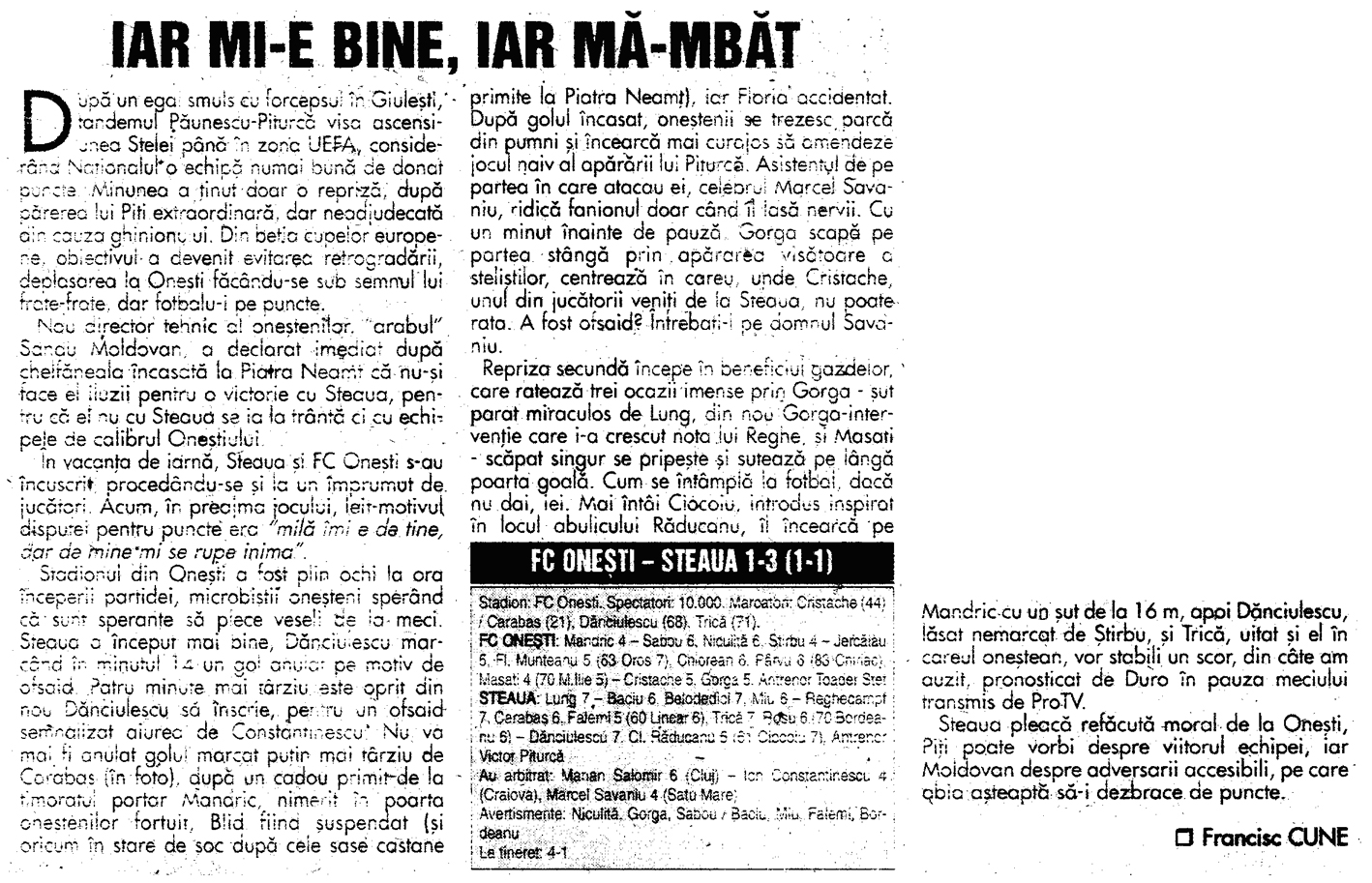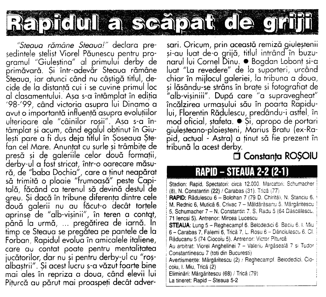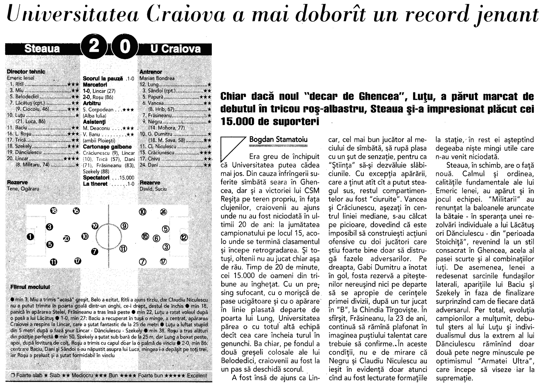 Prima jumatate a lunii martie, in istoria Stelei. 1995-2000Sezonul 1995-1996 isi disputa – ca de obicei cand echipa nationala se califica la un turneu final –, 4 etape din retur (etapele 18-21) in sezonul de toamna, intre 29 noiembrie si 13 decembrie 1995.Mini-returul debuta pe 28 februarie 1996, Steaua dispunand cu 2-1, in Ghencea, de Petrolul Ploiesti. Echipa militara (care terminase cu un avans de 8 puncte, la finele celor 17 etape ale turului legal) avea, inaintea etapei 22, o distanta de 5 lungimi in fata Rapidului (15 victorii, 3 egaluri si 4 infrangeri, golaveraj 54-22), distanta reducandu-se prin infrangerile Stelei in deplasarile de la adevarata Poli Timisoara (2-1, pe 2 decembrie) si de la National (1-0, pe 13 decembrie), in ce-ar fi trebuit sa insemne etapele cu numarul 2 si 4 ale returului, dar au insemnat etapele cu numerele 19 si 21 ale sezonului de toamna (turului) extins. Etapa 23 aduce, pe 2 martie 1996, un egal in Banie (1-1), Rapidul apropiindu-se la doar 3 puncte. Peste 3 zile, pe 6 martie 1996, Steaua isi revenea si spulbera cu 4-2 pe Dinamo, aratand cine-i stapanul campionatului si profitand de infrangerea (distrugerea) cu 4-2 (3-0 la pauza) a Rapidului la Constanţa, in faţa Făruţului si trecand la 6 lungimi in fata giulestenilor. Peste inca alte (doar) 3 zile, pe 9 martie 1996, Steaua se deplasa in Giulesti, unde scotea egalul care o tinea linistita pana la final, la o distanta care-i permitea sa abordeze cu mult calm ultimele etape din cursa catre titlul de campioana. Iesita bine dintr-un triunghi al mortii, cu 3 intalniri, in 9 zile, contra Universitatii Craiova, Dinamo si Rapid, Steaua invingea Otelul, cu 1-0, in Ghincea, pe 16 martie 1996 si se ducea catre titlul de campioana, pe care avea sa-l castige la 11 puncte in fata locului 2 (National) si la 12 puncte in fata locului 3 (Rapid). ![]() XXX Sezonul 1996-1997 isi programa prima etapa a returului pe 1 martie 1997, Steaua spulberand, in deplasare, vesnica echipa intalnita in luna martisorului, Otelul Galati, cu 5-1. Rezultatul era notabil caci Steaua (11 victorii, 2 egaluri, 4 infrangeri, golaveraj 34-19, 35 de puncte, dupa tur) era la egalitate de puncte cu National si la doar 2 puncte in fata locului 3, chiar Otelul Galati, marea revelatie a campionatului, care avea a doua cea mai buna aparare a campionatului (18 goluri primite), dupa Dinamo (17 goluri primite). Steaua incepea in stil de mare campioana. ![]() Pe 8 martie 1997, Steaua intalnea acasa Ceahlaul si pierdea, prin meciul egal, din aura cu care se inconjurase dupa victoria-declaratie de la Galati. Pe 12 martie 1997, Steaua spulbera total efect victoriei de pe Dunare si o ducea chiar spre statutul de accident, pierzand la Bacau, cu 1-0 si ducandu-se la 2 puncte sub National. In cele din urma, intr-o lupta cu multe impoticniri, dusa pana la final, Steaua a repreluat fotoliul de lider dupa etapa 31 si l-a mentinut pana la finalul unui campionat terminat la 5 puncte peste National. XXX Sezonul 1997-1998 programa primele 3 etape ale returului in sezonul de toamna, meciurile Stelei contra U Cluj, din 18 (3-2, in deplasare) si Jiului, din etapa 20 (5-1, in Ghencea) disputandu-se pe 29 decembrie, respectiv 13 februarie. Etapa cu numarul 19, programata pentru 6 decembrie, a fost reprogramata pentru Steaua, pe data de 4 martie 1998. Astfel, prima etapa a mini-returului s-a disputat pe 1 martie 1998, Steaua dispunand cu 2-0, in deplasare, de cvasi-vesnica echipa a lunii martie, Otelul Galati. ![]() Peste 3 zile, pe data de 4 martie 1998, Steaua disputa meciul contra Ceahlaului Piatra Neamt, amanat din data de 3 decembrie, meci care ar fi trebuit sa conteze pentru a doua etapa a turului, adica pentru etapa 19. ![]() Etapa cu numarul 22 a fost programata pe 8 martie si doar meciul Steaua – National s-a disputat pe 9 martie 1998. Steaua a facut – probabil – cel mai slab meci al sau din ultimii 8 ani, in confruntarile interne importante, parte din cauze si context putand fi lesne deslusite din lecturarea cronicilor si comentariilor. ![]() ![]() ![]() Ca de fiecare data cand Romania era acalificata la un turneu final (Coupe du Monde `98, de data asta), pe langa micsorarea numarului de meciuri pentru retur, chiar si acelea ramase se disputau (destule) in sistem miercuri-sambata. Astfel, la 3 zile dupa intalnirea cu bancarii, Steaua castiga, pe 11 martie 1998, la Resita, cu 2-0, dar mult, mult mai greu decat o arata scorul. ![]() ![]() Etapa 24, programata pe 14 martie 1998, aducea o victorie la limita, cu 1-0, in fata Bacaului si o ducea pe Steaua (care a terminat, in final, la 2 puncte in fata Rapidului lui Mircea Lucescu) spre al saselea titlu consecutiv, titlu care consfintea si incheia dominatia cvasi-totala din anii `90. ![]() XXX Sezonul 1998-1999 programa prima etapa a returului pe data de 6 martie 1999, Steaua castigand in fata clientilor nostri de la Universitatea Craiova, cu 2-0, in Ghencea. ![]() Etapa urmatoare, pe 13 martie 1999, Steaua se impunea la Universitatea Cluj, cu 2-0. ![]() Etapa cu numarul 20, din 17 martie 1999, arăta scaderea clara si definitiva de clasa a Stelei, confirma locul 3 de la finele turului (10 victorii, 4 egaluri, 3 infrangeri, golaveraj 31-15, 34 de puncte, cu 7 mai putine fata de Dinamo si cu 10 mai putine fata de Rapid) si anticipa locul 3 de la finalul campionatului (19 victorii, 9 egaluri, 6 infrangeri, golaveraj 62-33, 66 de puncte), la o absolut umilitoare distanta in spatele lui Dinamo (16 puncte in fata noastra) si la o absolut greu de acceptat ca posibilitate teoretica, macar, cvasi-neverosimila si halucinanta distanta de 23 de puncte in spatele campioanei Rapid (care, cu toate smenurile presei, care a impins-o de la spate si cu toate smenurile cu arbitrii lui Kassai si cu toate influentele reprezentantelor Samsung la arbitri, nu poate justifica diferenta decat prin vina exclusiva a conducatorilor clubului nostru). ![]() XXX Sezonul 1999-2000 a programat – datorita calificarii Romaniei la Campionatul 