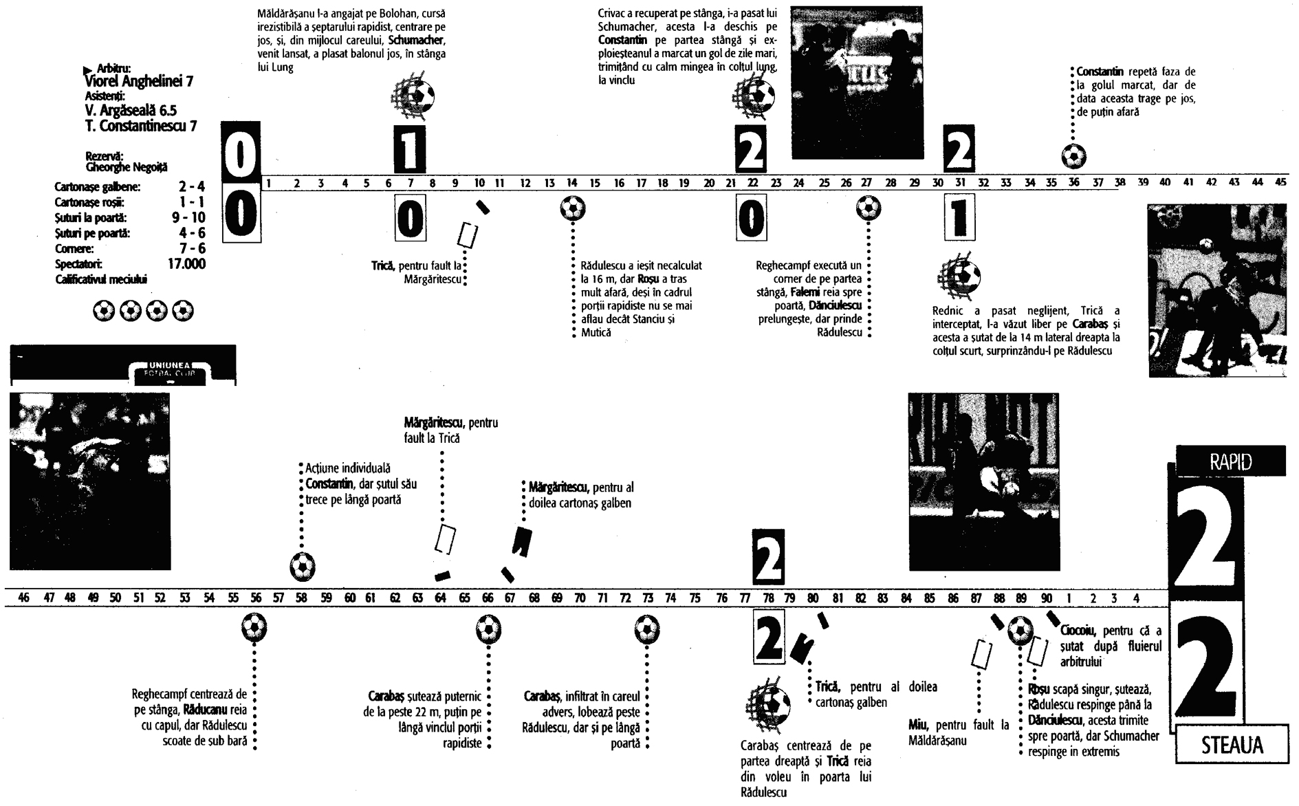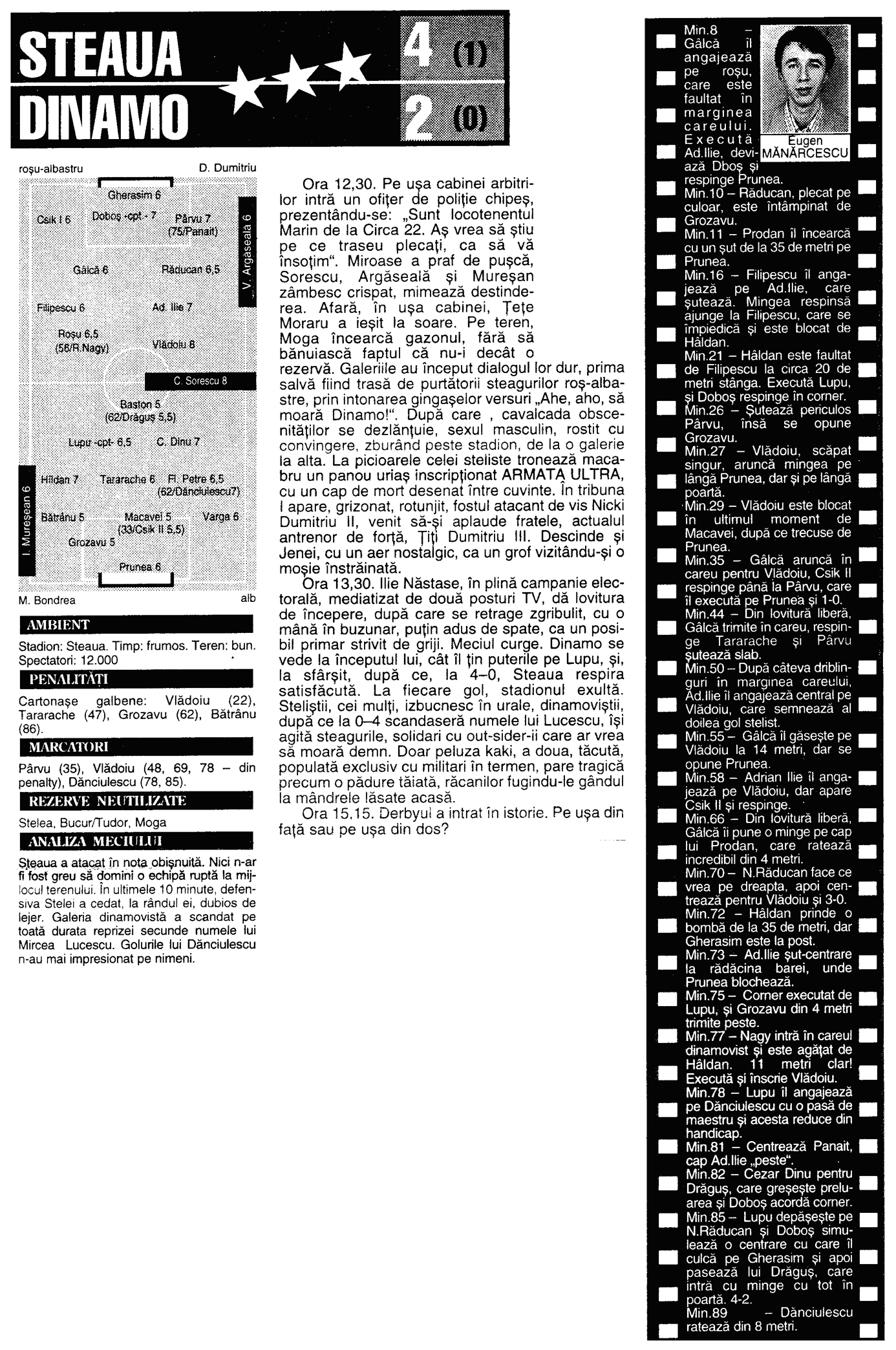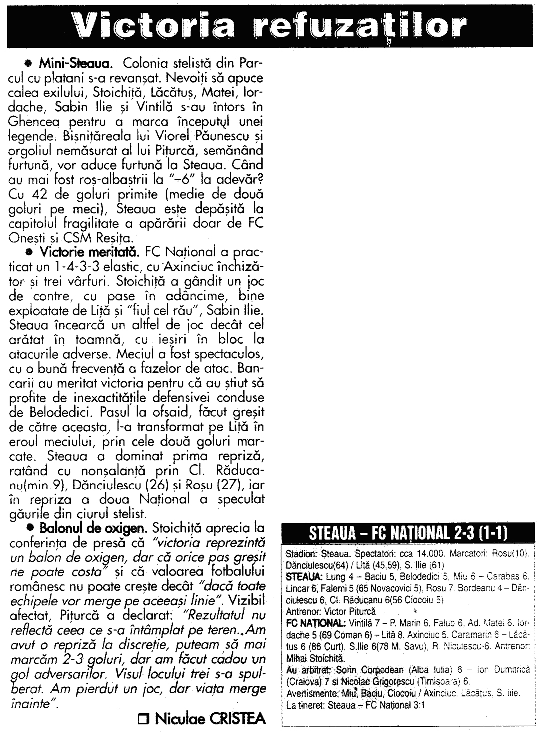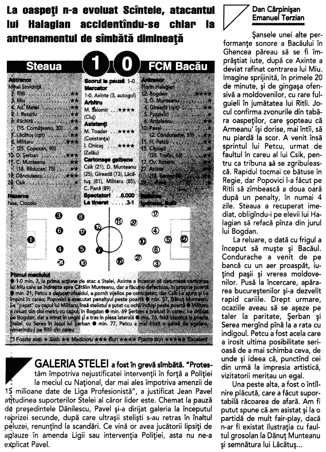 Prima jumatate a lunii martie, in istoria Stelei. 1995-2000Sezonul 1995-1996 isi disputa – ca de obicei cand echipa nationala se califica la un turneu final –, 4 etape din retur (etapele 18-21) in sezonul de toamna, intre 29 noiembrie si 13 decembrie 1995.Mini-returul debuta pe 28 februarie 1996, Steaua dispunand cu 2-1, in Ghencea, de Petrolul Ploiesti. Echipa militara (care terminase cu un avans de 8 puncte, la finele celor 17 etape ale turului legal) avea, inaintea etapei 22, o distanta de 5 lungimi in fata Rapidului (15 victorii, 3 egaluri si 4 infrangeri, golaveraj 54-22), distanta reducandu-se prin infrangerile Stelei in deplasarile de la adevarata Poli Timisoara (2-1, pe 2 decembrie) si de la National (1-0, pe 13 decembrie), in ce-ar fi trebuit sa insemne etapele cu numarul 2 si 4 ale returului, dar au insemnat etapele cu numerele 19 si 21 ale sezonului de toamna (turului) extins. Etapa 23 aduce, pe 2 martie 1996, un egal in Banie (1-1), Rapidul apropiindu-se la doar 3 puncte. Peste 3 zile, pe 6 martie 1996, Steaua isi revenea si spulbera cu 4-2 pe Dinamo, aratand cine-i stapanul campionatului si profitand de infrangerea (distrugerea) cu 4-2 (3-0 la pauza) a Rapidului la Constanţa, in faţa Făruţului si trecand la 6 lungimi in fata giulestenilor. Peste inca alte (doar) 3 zile, pe 9 martie 1996, Steaua se deplasa in Giulesti, unde scotea egalul care o tinea linistita pana la final, la o distanta care-i permitea sa abordeze cu mult calm ultimele etape din cursa catre titlul de campioana. Iesita bine dintr-un triunghi al mortii, cu 3 intalniri, in 9 zile, contra Universitatii Craiova, Dinamo si Rapid, Steaua invingea Otelul, cu 1-0, in Ghincea, pe 16 martie 1996 si se ducea catre titlul de campioana, pe care avea sa-l castige la 11 puncte in fata locului 2 (National) si la 12 puncte in fata locului 3 (Rapid). ![]() XXX Sezonul 1996-1997 isi programa prima etapa a returului pe 1 martie 1997, Steaua spulberand, in deplasare, vesnica echipa intalnita in luna martisorului, Otelul Galati, cu 5-1. Rezultatul era notabil caci Steaua (11 victorii, 2 egaluri, 4 infrangeri, golaveraj 34-19, 35 de puncte, dupa tur) era la egalitate de puncte cu National si la doar 2 puncte in fata locului 3, chiar Otelul Galati, marea revelatie a campionatului, care avea a doua cea mai buna aparare a campionatului (18 goluri primite), dupa Dinamo (17 goluri primite). Steaua incepea in stil de mare campioana. ![]() Pe 8 martie 1997, Steaua intalnea acasa Ceahlaul si pierdea, prin meciul egal, din aura cu care se inconjurase dupa victoria-declaratie de la Galati. Pe 12 martie 1997, Steaua spulbera total efect victoriei de pe Dunare si o ducea chiar spre statutul de accident, pierzand la Bacau, cu 1-0 si ducandu-se la 2 puncte sub National. In cele din urma, intr-o lupta cu multe impoticniri, dusa pana la final, Steaua a repreluat fotoliul de lider dupa etapa 31 si l-a mentinut pana la finalul unui campionat terminat la 5 puncte peste National. XXX Sezonul 1997-1998 programa primele 3 etape ale returului in sezonul de toamna, meciurile Stelei contra U Cluj, din 18 (3-2, in deplasare) si Jiului, din etapa 20 (5-1, in Ghencea) disputandu-se pe 29 decembrie, respectiv 13 februarie. Etapa cu numarul 19, programata pentru 6 decembrie, a fost reprogramata pentru Steaua, pe data de 4 martie 1998. Astfel, prima etapa a mini-returului s-a disputat pe 1 martie 1998, Steaua dispunand cu 2-0, in deplasare, de cvasi-vesnica echipa a lunii martie, Otelul Galati. ![]() Peste 3 zile, pe data de 4 martie 1998, Steaua disputa meciul contra Ceahlaului Piatra Neamt, amanat din data de 3 decembrie, meci care ar fi trebuit sa conteze pentru a doua etapa a turului, adica pentru etapa 19. ![]() Etapa cu numarul 22 a fost programata pe 8 martie si doar meciul Steaua – National s-a disputat pe 9 martie 1998. Steaua a facut – probabil – cel mai slab meci al sau din ultimii 8 ani, in confruntarile interne importante, parte din cauze si context putand fi lesne deslusite din lecturarea cronicilor si comentariilor. ![]() ![]() ![]() Ca de fiecare data cand Romania era acalificata la un turneu final (Coupe du Monde `98, de data asta), pe langa micsorarea numarului de meciuri pentru retur, chiar si acelea ramase se disputau (destule) in sistem miercuri-sambata. Astfel, la 3 zile dupa intalnirea cu bancarii, Steaua castiga, pe 11 martie 1998, la Resita, cu 2-0, dar mult, mult mai greu decat o arata scorul. ![]() ![]() Etapa 24, programata pe 14 martie 1998, aducea o victorie la limita, cu 1-0, in fata Bacaului si o ducea pe Steaua (care a terminat, in final, la 2 puncte in fata Rapidului lui Mircea Lucescu) spre al saselea titlu consecutiv, titlu care consfintea si incheia dominatia cvasi-totala din anii `90. ![]() XXX Sezonul 1998-1999 programa prima etapa a returului pe data de 6 martie 1999, Steaua castigand in fata clientilor nostri de la Universitatea Craiova, cu 2-0, in Ghencea. ![]() Etapa urmatoare, pe 13 martie 1999, Steaua se impunea la Universitatea Cluj, cu 2-0. ![]() Etapa cu numarul 20, din 17 martie 1999, arăta scaderea clara si definitiva de clasa a Stelei, confirma locul 3 de la finele turului (10 victorii, 4 egaluri, 3 infrangeri, golaveraj 31-15, 34 de puncte, cu 7 mai putine fata de Dinamo si cu 10 mai putine fata de Rapid) si anticipa locul 3 de la finalul campionatului (19 victorii, 9 egaluri, 6 infrangeri, golaveraj 62-33, 66 de puncte), la o absolut umilitoare distanta in spatele lui Dinamo (16 puncte in fata noastra) si la o absolut greu de acceptat ca posibilitate teoretica, macar, cvasi-neverosimila si halucinanta distanta de 23 de puncte in spatele campioanei Rapid (care, cu toate smenurile presei, care a impins-o de la spate si cu toate smenurile cu arbitrii lui Kassai si cu toate influentele reprezentantelor Samsung la arbitri, nu poate justifica diferenta decat prin vina exclusiva a conducatorilor clubului nostru). ![]() XXX Sezonul 1999-2000 a programat – datorita calificarii Romaniei la Campionatul 