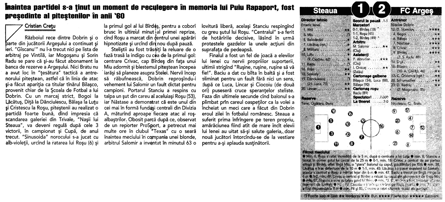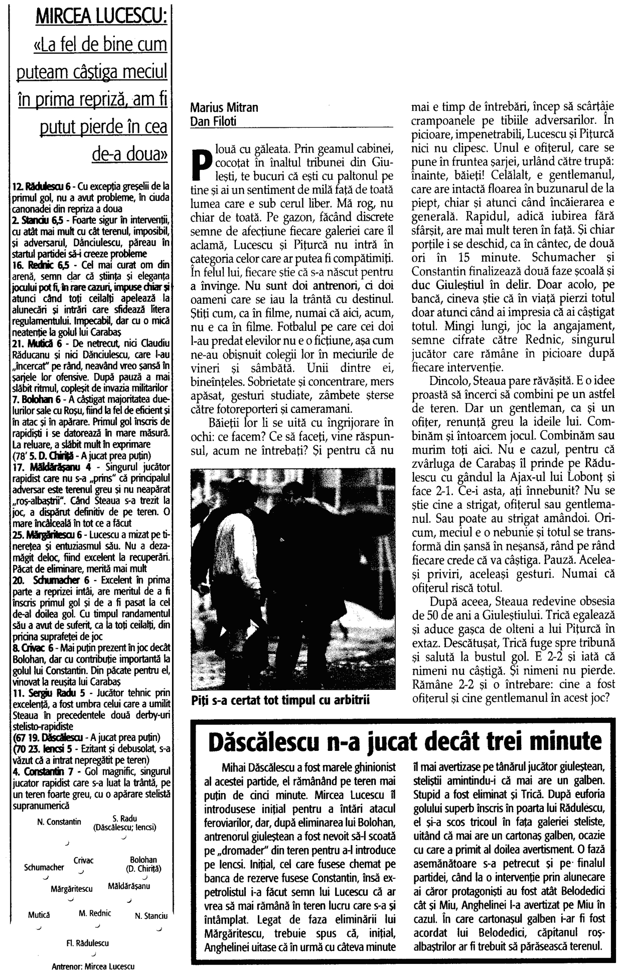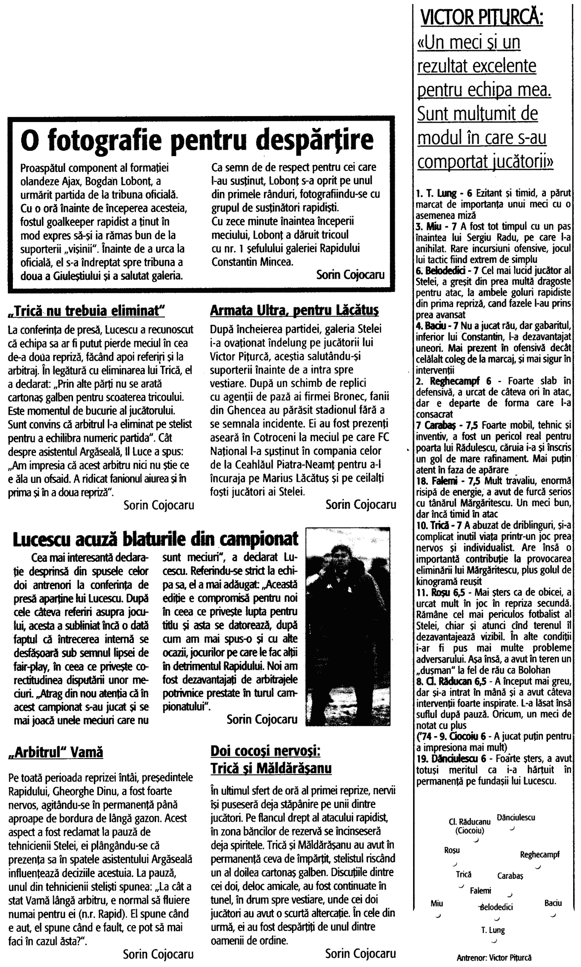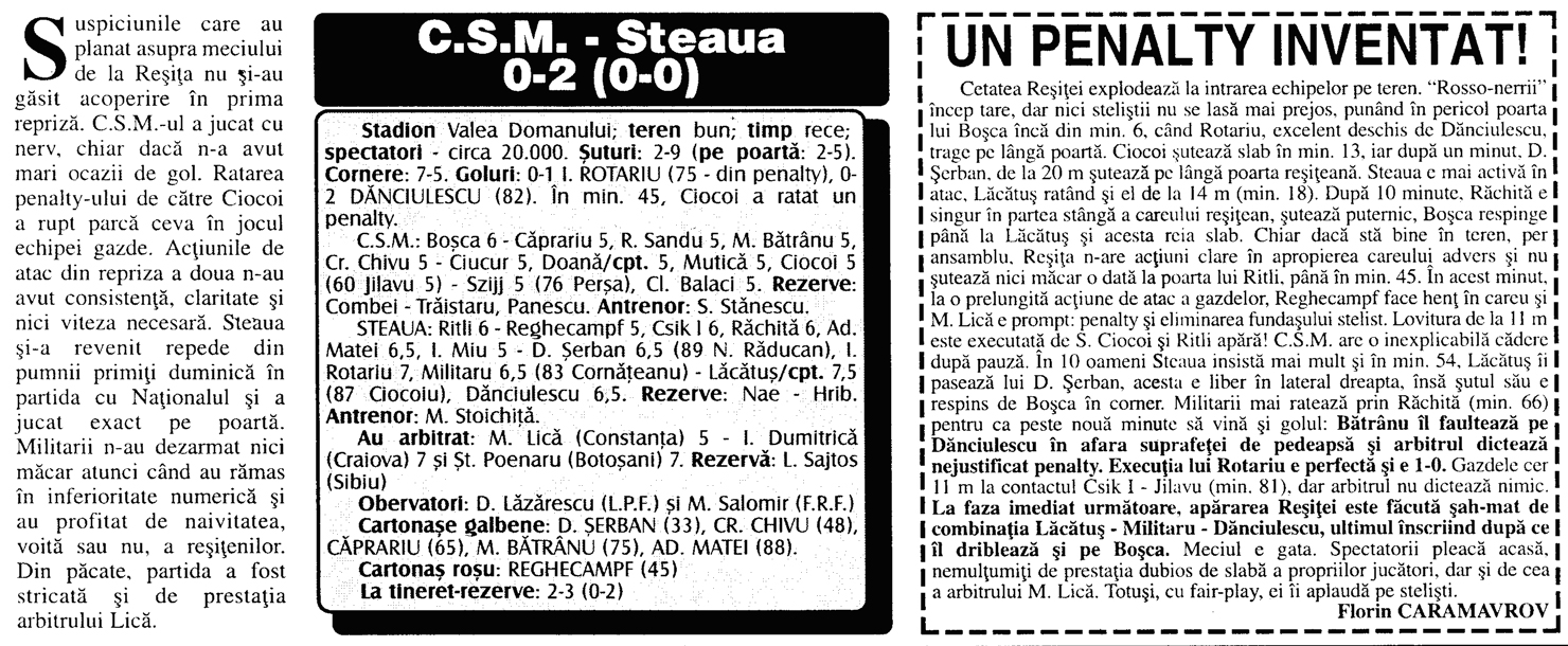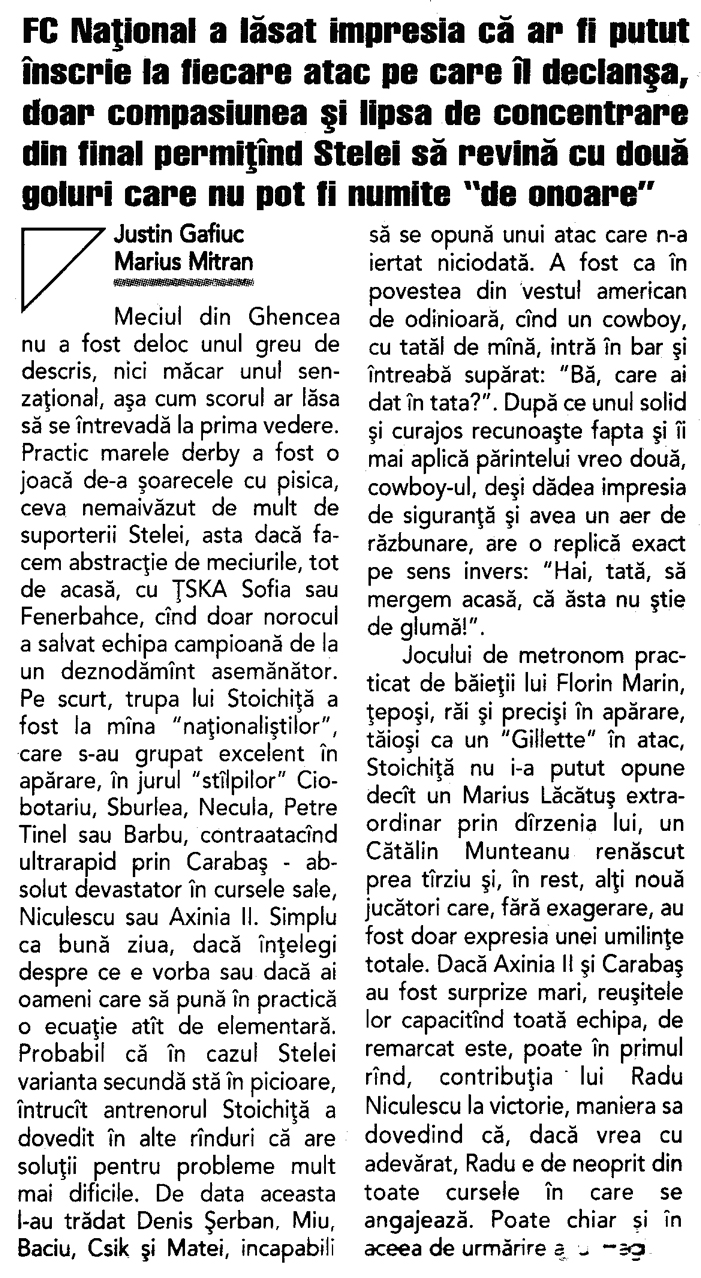 Prima jumatate a lunii martie, in istoria Stelei. 1995-2000Sezonul 1995-1996 isi disputa – ca de obicei cand echipa nationala se califica la un turneu final –, 4 etape din retur (etapele 18-21) in sezonul de toamna, intre 29 noiembrie si 13 decembrie 1995.Mini-returul debuta pe 28 februarie 1996, Steaua dispunand cu 2-1, in Ghencea, de Petrolul Ploiesti. Echipa militara (care terminase cu un avans de 8 puncte, la finele celor 17 etape ale turului legal) avea, inaintea etapei 22, o distanta de 5 lungimi in fata Rapidului (15 victorii, 3 egaluri si 4 infrangeri, golaveraj 54-22), distanta reducandu-se prin infrangerile Stelei in deplasarile de la adevarata Poli Timisoara (2-1, pe 2 decembrie) si de la National (1-0, pe 13 decembrie), in ce-ar fi trebuit sa insemne etapele cu numarul 2 si 4 ale returului, dar au insemnat etapele cu numerele 19 si 21 ale sezonului de toamna (turului) extins. Etapa 23 aduce, pe 2 martie 1996, un egal in Banie (1-1), Rapidul apropiindu-se la doar 3 puncte. Peste 3 zile, pe 6 martie 1996, Steaua isi revenea si spulbera cu 4-2 pe Dinamo, aratand cine-i stapanul campionatului si profitand de infrangerea (distrugerea) cu 4-2 (3-0 la pauza) a Rapidului la Constanţa, in faţa Făruţului si trecand la 6 lungimi in fata giulestenilor. Peste inca alte (doar) 3 zile, pe 9 martie 1996, Steaua se deplasa in Giulesti, unde scotea egalul care o tinea linistita pana la final, la o distanta care-i permitea sa abordeze cu mult calm ultimele etape din cursa catre titlul de campioana. Iesita bine dintr-un triunghi al mortii, cu 3 intalniri, in 9 zile, contra Universitatii Craiova, Dinamo si Rapid, Steaua invingea Otelul, cu 1-0, in Ghincea, pe 16 martie 1996 si se ducea catre titlul de campioana, pe care avea sa-l castige la 11 puncte in fata locului 2 (National) si la 12 puncte in fata locului 3 (Rapid). ![]() XXX Sezonul 1996-1997 isi programa prima etapa a returului pe 1 martie 1997, Steaua spulberand, in deplasare, vesnica echipa intalnita in luna martisorului, Otelul Galati, cu 5-1. Rezultatul era notabil caci Steaua (11 victorii, 2 egaluri, 4 infrangeri, golaveraj 34-19, 35 de puncte, dupa tur) era la egalitate de puncte cu National si la doar 2 puncte in fata locului 3, chiar Otelul Galati, marea revelatie a campionatului, care avea a doua cea mai buna aparare a campionatului (18 goluri primite), dupa Dinamo (17 goluri primite). Steaua incepea in stil de mare campioana. ![]() Pe 8 martie 1997, Steaua intalnea acasa Ceahlaul si pierdea, prin meciul egal, din aura cu care se inconjurase dupa victoria-declaratie de la Galati. Pe 12 martie 1997, Steaua spulbera total efect victoriei de pe Dunare si o ducea chiar spre statutul de accident, pierzand la Bacau, cu 1-0 si ducandu-se la 2 puncte sub National. In cele din urma, intr-o lupta cu multe impoticniri, dusa pana la final, Steaua a repreluat fotoliul de lider dupa etapa 31 si l-a mentinut pana la finalul unui campionat terminat la 5 puncte peste National. XXX Sezonul 1997-1998 programa primele 3 etape ale returului in sezonul de toamna, meciurile Stelei contra U Cluj, din 18 (3-2, in deplasare) si Jiului, din etapa 20 (5-1, in Ghencea) disputandu-se pe 29 decembrie, respectiv 13 februarie. Etapa cu numarul 19, programata pentru 6 decembrie, a fost reprogramata pentru Steaua, pe data de 4 martie 1998. Astfel, prima etapa a mini-returului s-a disputat pe 1 martie 1998, Steaua dispunand cu 2-0, in deplasare, de cvasi-vesnica echipa a lunii martie, Otelul Galati. ![]() Peste 3 zile, pe data de 4 martie 1998, Steaua disputa meciul contra Ceahlaului Piatra Neamt, amanat din data de 3 decembrie, meci care ar fi trebuit sa conteze pentru a doua etapa a turului, adica pentru etapa 19. ![]() Etapa cu numarul 22 a fost programata pe 8 martie si doar meciul Steaua – National s-a disputat pe 9 martie 1998. Steaua a facut – probabil – cel mai slab meci al sau din ultimii 8 ani, in confruntarile interne importante, parte din cauze si context putand fi lesne deslusite din lecturarea cronicilor si comentariilor. ![]() ![]() ![]() Ca de fiecare data cand Romania era acalificata la un turneu final (Coupe du Monde `98, de data asta), pe langa micsorarea numarului de meciuri pentru retur, chiar si acelea ramase se disputau (destule) in sistem miercuri-sambata. Astfel, la 3 zile dupa intalnirea cu bancarii, Steaua castiga, pe 11 martie 1998, la Resita, cu 2-0, dar mult, mult mai greu decat o arata scorul. ![]() ![]() Etapa 24, programata pe 14 martie 1998, aducea o victorie la limita, cu 1-0, in fata Bacaului si o ducea pe Steaua (care a terminat, in final, la 2 puncte in fata Rapidului lui Mircea Lucescu) spre al saselea titlu consecutiv, titlu care consfintea si incheia dominatia cvasi-totala din anii `90. ![]() XXX Sezonul 1998-1999 programa prima etapa a returului pe data de 6 martie 1999, Steaua castigand in fata clientilor nostri de la Universitatea Craiova, cu 2-0, in Ghencea. ![]() Etapa urmatoare, pe 13 martie 1999, Steaua se impunea la Universitatea Cluj, cu 2-0. ![]() Etapa cu numarul 20, din 17 martie 1999, arăta scaderea clara si definitiva de clasa a Stelei, confirma locul 3 de la finele turului (10 victorii, 4 egaluri, 3 infrangeri, golaveraj 31-15, 34 de puncte, cu 7 mai putine fata de Dinamo si cu 10 mai putine fata de Rapid) si anticipa locul 3 de la finalul campionatului (19 victorii, 9 egaluri, 6 infrangeri, golaveraj 62-33, 66 de puncte), la o absolut umilitoare distanta in spatele lui Dinamo (16 puncte in fata noastra) si la o absolut greu de acceptat ca posibilitate teoretica, macar, cvasi-neverosimila si halucinanta distanta de 23 de puncte in spatele campioanei Rapid (care, cu toate smenurile presei, care a impins-o de la spate si cu toate smenurile cu arbitrii lui Kassai si cu toate influentele reprezentantelor Samsung la arbitri, nu poate justifica diferenta decat prin vina exclusiva a conducatorilor clubului nostru). ![]() XXX Sezonul 1999-2000 a programat – datorita calificarii Romaniei la Campionatul 