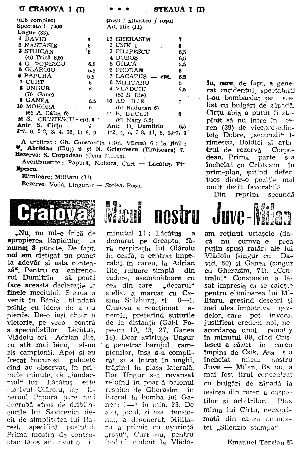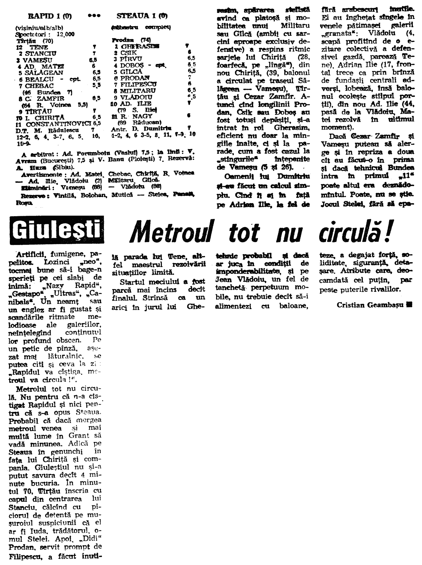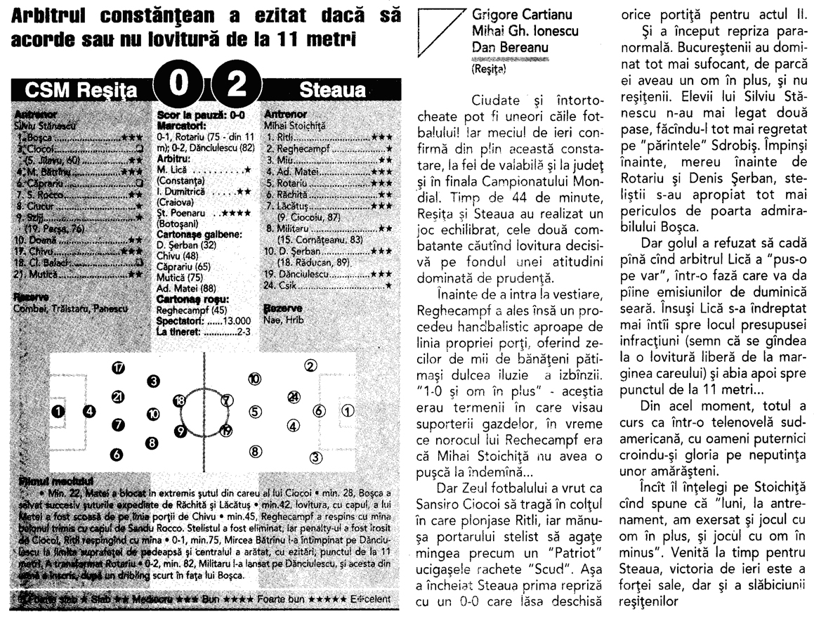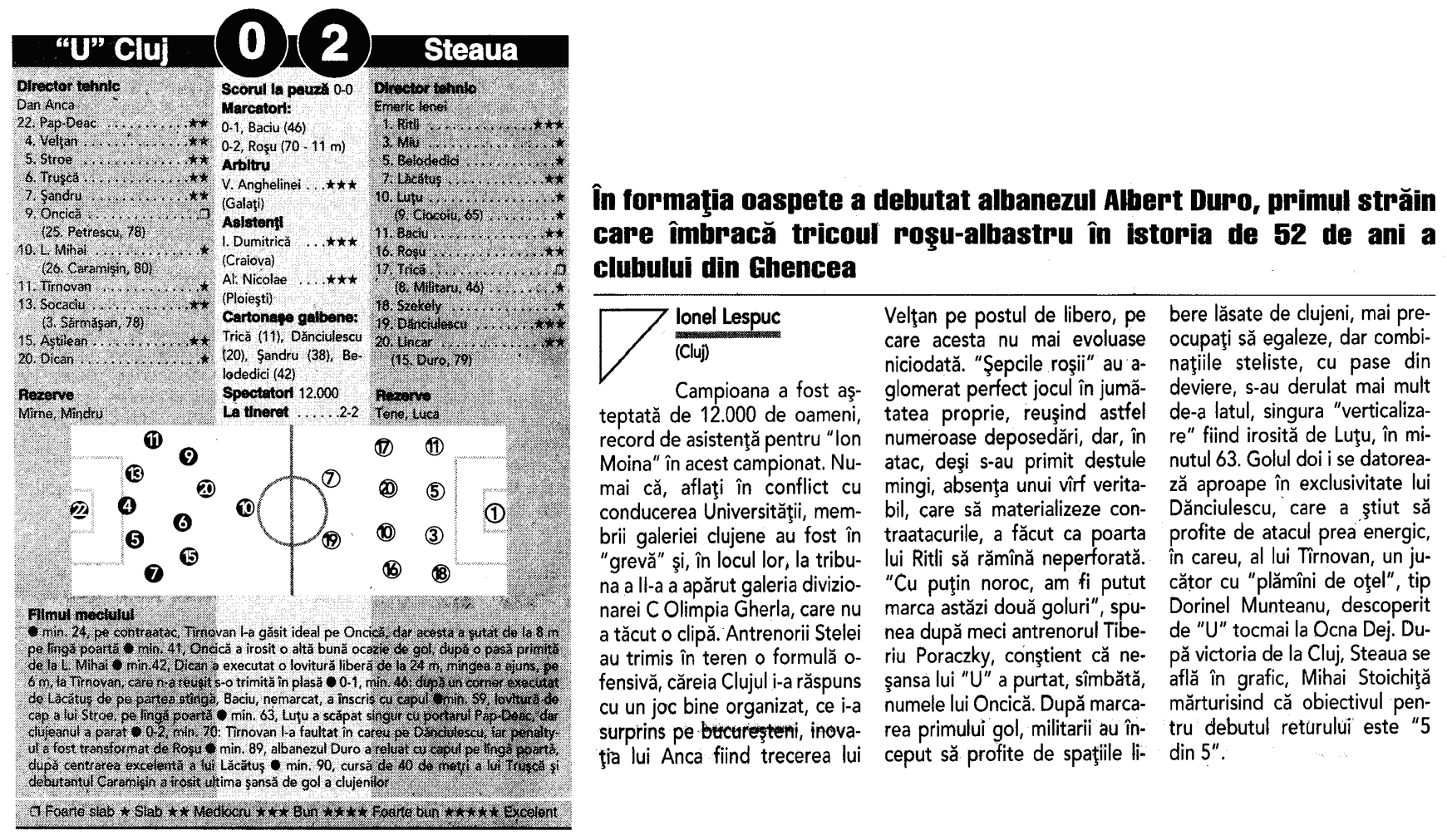 Prima jumatate a lunii martie, in istoria Stelei. 1995-2000Sezonul 1995-1996 isi disputa – ca de obicei cand echipa nationala se califica la un turneu final –, 4 etape din retur (etapele 18-21) in sezonul de toamna, intre 29 noiembrie si 13 decembrie 1995.Mini-returul debuta pe 28 februarie 1996, Steaua dispunand cu 2-1, in Ghencea, de Petrolul Ploiesti. Echipa militara (care terminase cu un avans de 8 puncte, la finele celor 17 etape ale turului legal) avea, inaintea etapei 22, o distanta de 5 lungimi in fata Rapidului (15 victorii, 3 egaluri si 4 infrangeri, golaveraj 54-22), distanta reducandu-se prin infrangerile Stelei in deplasarile de la adevarata Poli Timisoara (2-1, pe 2 decembrie) si de la National (1-0, pe 13 decembrie), in ce-ar fi trebuit sa insemne etapele cu numarul 2 si 4 ale returului, dar au insemnat etapele cu numerele 19 si 21 ale sezonului de toamna (turului) extins. Etapa 23 aduce, pe 2 martie 1996, un egal in Banie (1-1), Rapidul apropiindu-se la doar 3 puncte. Peste 3 zile, pe 6 martie 1996, Steaua isi revenea si spulbera cu 4-2 pe Dinamo, aratand cine-i stapanul campionatului si profitand de infrangerea (distrugerea) cu 4-2 (3-0 la pauza) a Rapidului la Constanţa, in faţa Făruţului si trecand la 6 lungimi in fata giulestenilor. Peste inca alte (doar) 3 zile, pe 9 martie 1996, Steaua se deplasa in Giulesti, unde scotea egalul care o tinea linistita pana la final, la o distanta care-i permitea sa abordeze cu mult calm ultimele etape din cursa catre titlul de campioana. Iesita bine dintr-un triunghi al mortii, cu 3 intalniri, in 9 zile, contra Universitatii Craiova, Dinamo si Rapid, Steaua invingea Otelul, cu 1-0, in Ghincea, pe 16 martie 1996 si se ducea catre titlul de campioana, pe care avea sa-l castige la 11 puncte in fata locului 2 (National) si la 12 puncte in fata locului 3 (Rapid). ![]() XXX Sezonul 1996-1997 isi programa prima etapa a returului pe 1 martie 1997, Steaua spulberand, in deplasare, vesnica echipa intalnita in luna martisorului, Otelul Galati, cu 5-1. Rezultatul era notabil caci Steaua (11 victorii, 2 egaluri, 4 infrangeri, golaveraj 34-19, 35 de puncte, dupa tur) era la egalitate de puncte cu National si la doar 2 puncte in fata locului 3, chiar Otelul Galati, marea revelatie a campionatului, care avea a doua cea mai buna aparare a campionatului (18 goluri primite), dupa Dinamo (17 goluri primite). Steaua incepea in stil de mare campioana. ![]() Pe 8 martie 1997, Steaua intalnea acasa Ceahlaul si pierdea, prin meciul egal, din aura cu care se inconjurase dupa victoria-declaratie de la Galati. Pe 12 martie 1997, Steaua spulbera total efect victoriei de pe Dunare si o ducea chiar spre statutul de accident, pierzand la Bacau, cu 1-0 si ducandu-se la 2 puncte sub National. In cele din urma, intr-o lupta cu multe impoticniri, dusa pana la final, Steaua a repreluat fotoliul de lider dupa etapa 31 si l-a mentinut pana la finalul unui campionat terminat la 5 puncte peste National. XXX Sezonul 1997-1998 programa primele 3 etape ale returului in sezonul de toamna, meciurile Stelei contra U Cluj, din 18 (3-2, in deplasare) si Jiului, din etapa 20 (5-1, in Ghencea) disputandu-se pe 29 decembrie, respectiv 13 februarie. Etapa cu numarul 19, programata pentru 6 decembrie, a fost reprogramata pentru Steaua, pe data de 4 martie 1998. Astfel, prima etapa a mini-returului s-a disputat pe 1 martie 1998, Steaua dispunand cu 2-0, in deplasare, de cvasi-vesnica echipa a lunii martie, Otelul Galati. ![]() Peste 3 zile, pe data de 4 martie 1998, Steaua disputa meciul contra Ceahlaului Piatra Neamt, amanat din data de 3 decembrie, meci care ar fi trebuit sa conteze pentru a doua etapa a turului, adica pentru etapa 19. ![]() Etapa cu numarul 22 a fost programata pe 8 martie si doar meciul Steaua – National s-a disputat pe 9 martie 1998. Steaua a facut – probabil – cel mai slab meci al sau din ultimii 8 ani, in confruntarile interne importante, parte din cauze si context putand fi lesne deslusite din lecturarea cronicilor si comentariilor. ![]() ![]() ![]() Ca de fiecare data cand Romania era acalificata la un turneu final (Coupe du Monde `98, de data asta), pe langa micsorarea numarului de meciuri pentru retur, chiar si acelea ramase se disputau (destule) in sistem miercuri-sambata. Astfel, la 3 zile dupa intalnirea cu bancarii, Steaua castiga, pe 11 martie 1998, la Resita, cu 2-0, dar mult, mult mai greu decat o arata scorul. ![]() ![]() Etapa 24, programata pe 14 martie 1998, aducea o victorie la limita, cu 1-0, in fata Bacaului si o ducea pe Steaua (care a terminat, in final, la 2 puncte in fata Rapidului lui Mircea Lucescu) spre al saselea titlu consecutiv, titlu care consfintea si incheia dominatia cvasi-totala din anii `90. ![]() XXX Sezonul 1998-1999 programa prima etapa a returului pe data de 6 martie 1999, Steaua castigand in fata clientilor nostri de la Universitatea Craiova, cu 2-0, in Ghencea. ![]() Etapa urmatoare, pe 13 martie 1999, Steaua se impunea la Universitatea Cluj, cu 2-0. ![]() Etapa cu numarul 20, din 17 martie 1999, arăta scaderea clara si definitiva de clasa a Stelei, confirma locul 3 de la finele turului (10 victorii, 4 egaluri, 3 infrangeri, golaveraj 31-15, 34 de puncte, cu 7 mai putine fata de Dinamo si cu 10 mai putine fata de Rapid) si anticipa locul 3 de la finalul campionatului (19 victorii, 9 egaluri, 6 infrangeri, golaveraj 62-33, 66 de puncte), la o absolut umilitoare distanta in spatele lui Dinamo (16 puncte in fata noastra) si la o absolut greu de acceptat ca posibilitate teoretica, macar, cvasi-neverosimila si halucinanta distanta de 23 de puncte in spatele campioanei Rapid (care, cu toate smenurile presei, care a impins-o de la spate si cu toate smenurile cu arbitrii lui Kassai si cu toate influentele reprezentantelor Samsung la arbitri, nu poate justifica diferenta decat prin vina exclusiva a conducatorilor clubului nostru). ![]() XXX Sezonul 1999-2000 a programat – datorita calificarii Romaniei la Campionatul 
