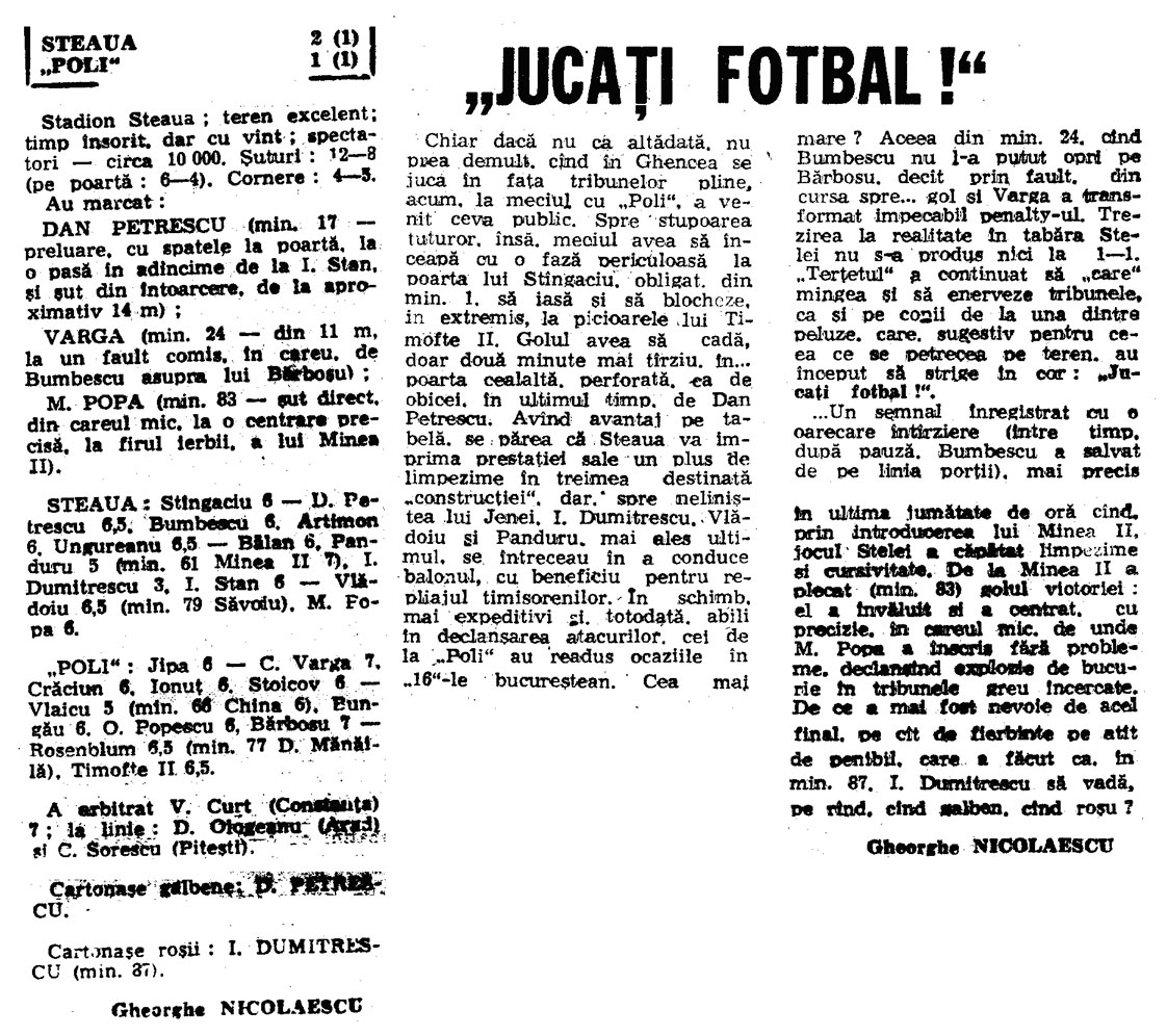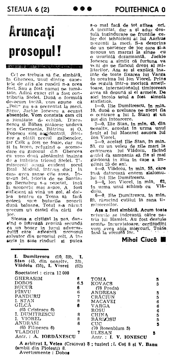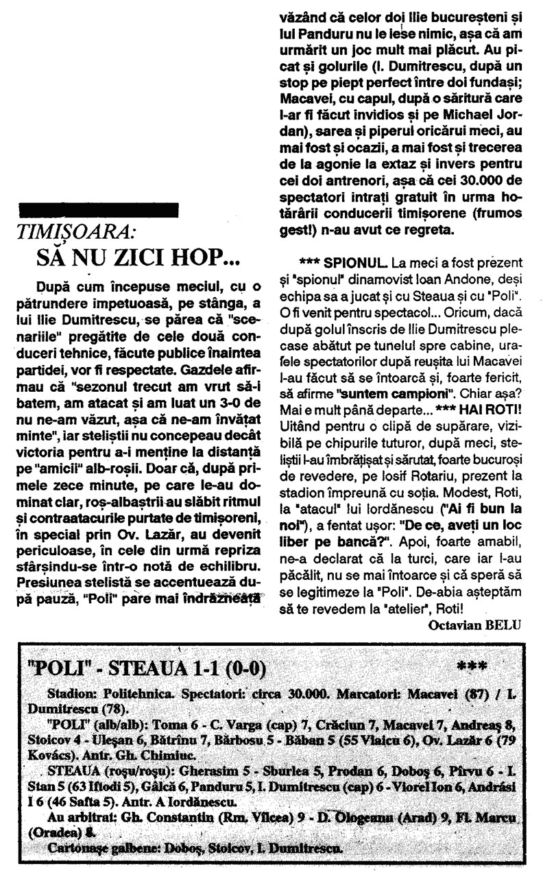 Istoricul intalnirilor Steaua Bucuresti – Politehnica Timisoara; 1990-1994Lecturarea cronicilor de meci, pentru 7 din cele 8 intalniri, din campionat, din perioada 1990-1994, dintre Adevarata Steaua si Adevarata Poli Timisoara, plus intalnirea din Finala Cupei Romaniei, da ocazia unor momente de evadare din drama suportarii unei farse grotesti, cu Fc Pipera si Fc Bragadiru jucand tontoroiu pe istoricele vestigii.Cu unica diferenta ca, de partea unui vestigiu, mai sunt cativa care (inca) mai au puterea de a denunta anormalitatea, in timp ce apropiatii de Viena ar trebui sa se vopseasca toti pe fete pentru ingroparea adevaratei Poli in uitare si imbratisarea in corpore a expresiei a aceea ce dispretuiesc ei cel mai mult – miticii –, ocazie sa-si clameze superioritatea, din vehiculul mutat la comanda de mitici din Berceni-Bragadiru si innecat in titeiul mandrei lor de civilizati si morali vestici. 1990-1991; retur (etapa 28), 19 mai 1991: 1991-1992; tur (etapa 13), 1 decembrie 1991: ![]() 1991-1992; (etapa 30), 31 mai 1992: ![]() FINALA CUPEI ROMANIEI, EDITIA 1991-1992 (24 iunie 1992) ![]() ![]() 1992-1993; tur (etapa 10), 17 octombrie 1992: ![]() 1992-1993; retur (etapa 27); 8 mai 1993: ![]() 1993-1994; tur (etapa 11); 23 octombrie 1993: ![]() 1993-1994; retur (etapa 28); 30 martie 1994: ![]() Filip Pindean FCSTEAUA.RO este un site deschis, facut de suporteri, pentru suporteri. Asteptam articolele scrise de voi, daca aveti ceva de spus si credeti ca o puteti face intr-un articol, nu ezitati!