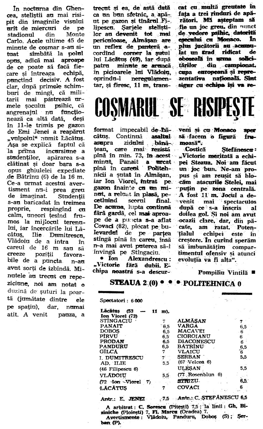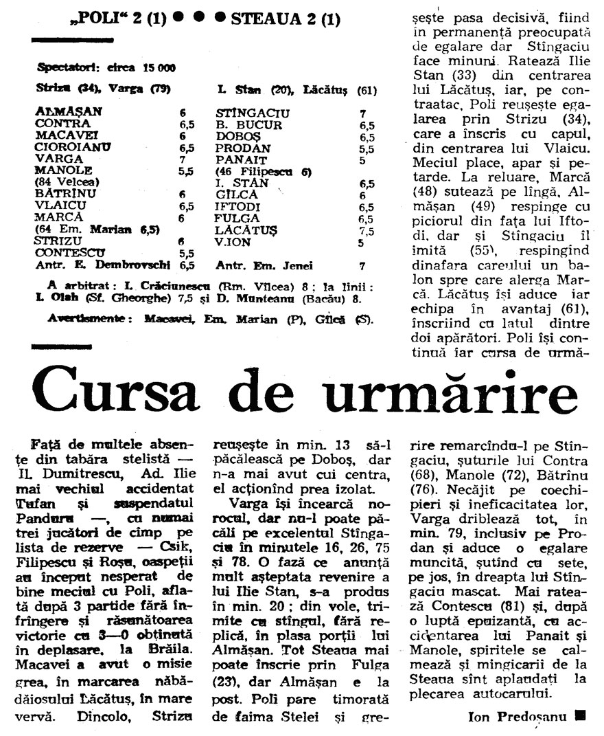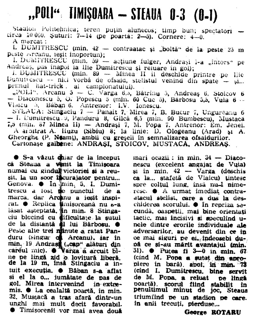 Istoricul intalnirilor Steaua Bucuresti – Politehnica Timisoara; 1990-1994Lecturarea cronicilor de meci, pentru 7 din cele 8 intalniri, din campionat, din perioada 1990-1994, dintre Adevarata Steaua si Adevarata Poli Timisoara, plus intalnirea din Finala Cupei Romaniei, da ocazia unor momente de evadare din drama suportarii unei farse grotesti, cu Fc Pipera si Fc Bragadiru jucand tontoroiu pe istoricele vestigii.Cu unica diferenta ca, de partea unui vestigiu, mai sunt cativa care (inca) mai au puterea de a denunta anormalitatea, in timp ce apropiatii de Viena ar trebui sa se vopseasca toti pe fete pentru ingroparea adevaratei Poli in uitare si imbratisarea in corpore a expresiei a aceea ce dispretuiesc ei cel mai mult – miticii –, ocazie sa-si clameze superioritatea, din vehiculul mutat la comanda de mitici din Berceni-Bragadiru si innecat in titeiul mandrei lor de civilizati si morali vestici. 1990-1991; retur (etapa 28), 19 mai 1991: 1991-1992; tur (etapa 13), 1 decembrie 1991: ![]() 1991-1992; (etapa 30), 31 mai 1992: ![]() FINALA CUPEI ROMANIEI, EDITIA 1991-1992 (24 iunie 1992) ![]() ![]() 1992-1993; tur (etapa 10), 17 octombrie 1992: ![]() 1992-1993; retur (etapa 27); 8 mai 1993: ![]() 1993-1994; tur (etapa 11); 23 octombrie 1993: ![]() 1993-1994; retur (etapa 28); 30 martie 1994: ![]() Filip Pindean FCSTEAUA.RO este un site deschis, facut de suporteri, pentru suporteri. Asteptam articolele scrise de voi, daca aveti ceva de spus si credeti ca o puteti face intr-un articol, nu ezitati!