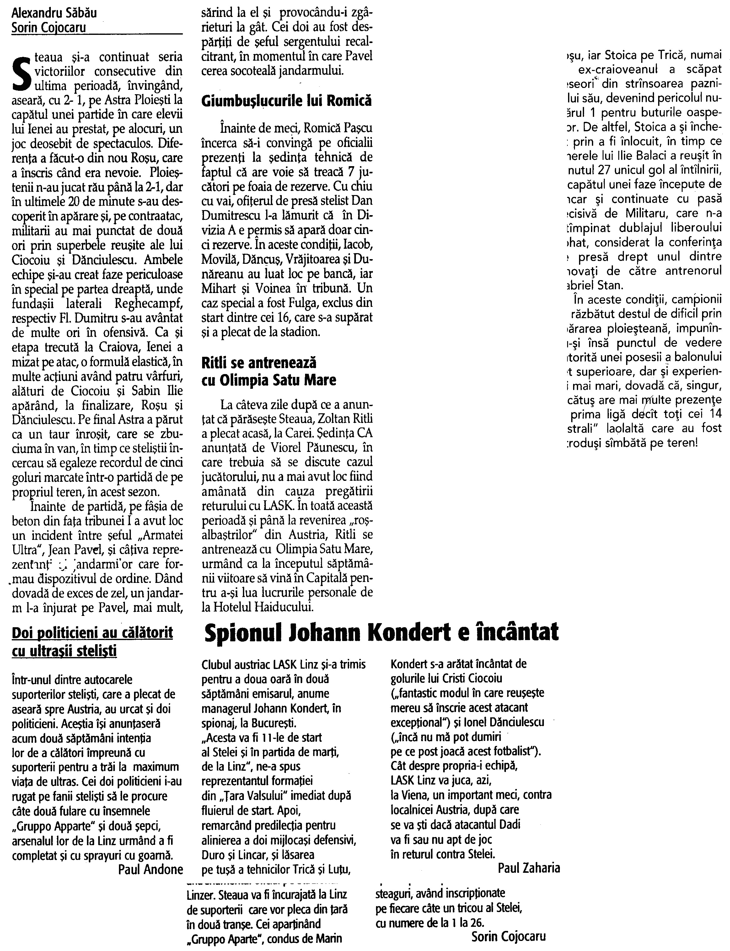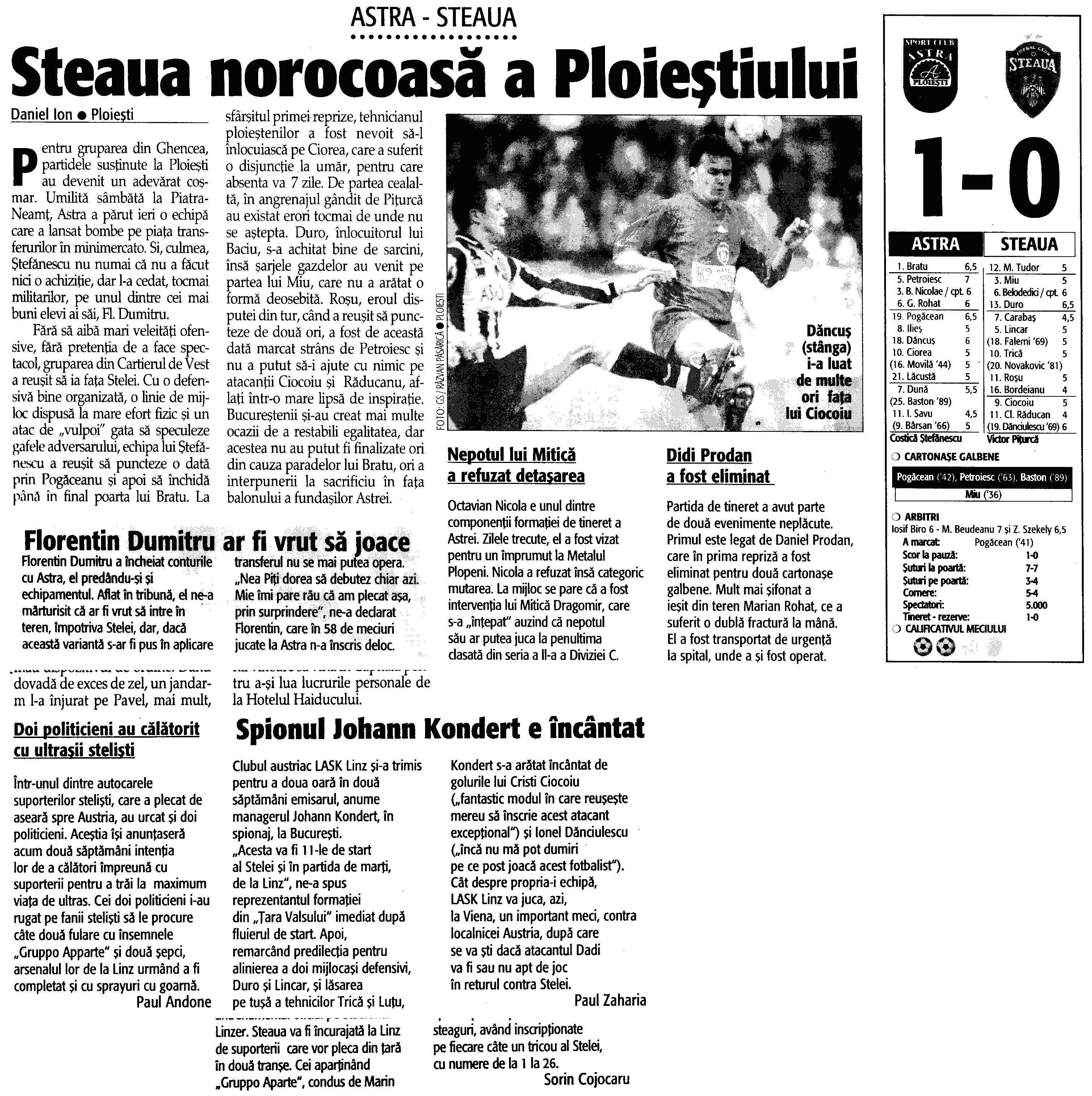 Asadar, meci de vacanta, Astra fiind in afara oricarei griji, terminand pe locul 10 din 18. la Astra il remarcam pe Daniel Dunareanu, fostul junior al Stelei (si un nume care a ramas in istora Stelei, din ratiuni pe care le vom explica la momentul potrivit), iar la Steaua pe noul fundas stanga venit de la Satu Mare, Mihaita Szekely (marcatorul golului nostru), si pe viitorul yankeu Alexandru Zotinca.