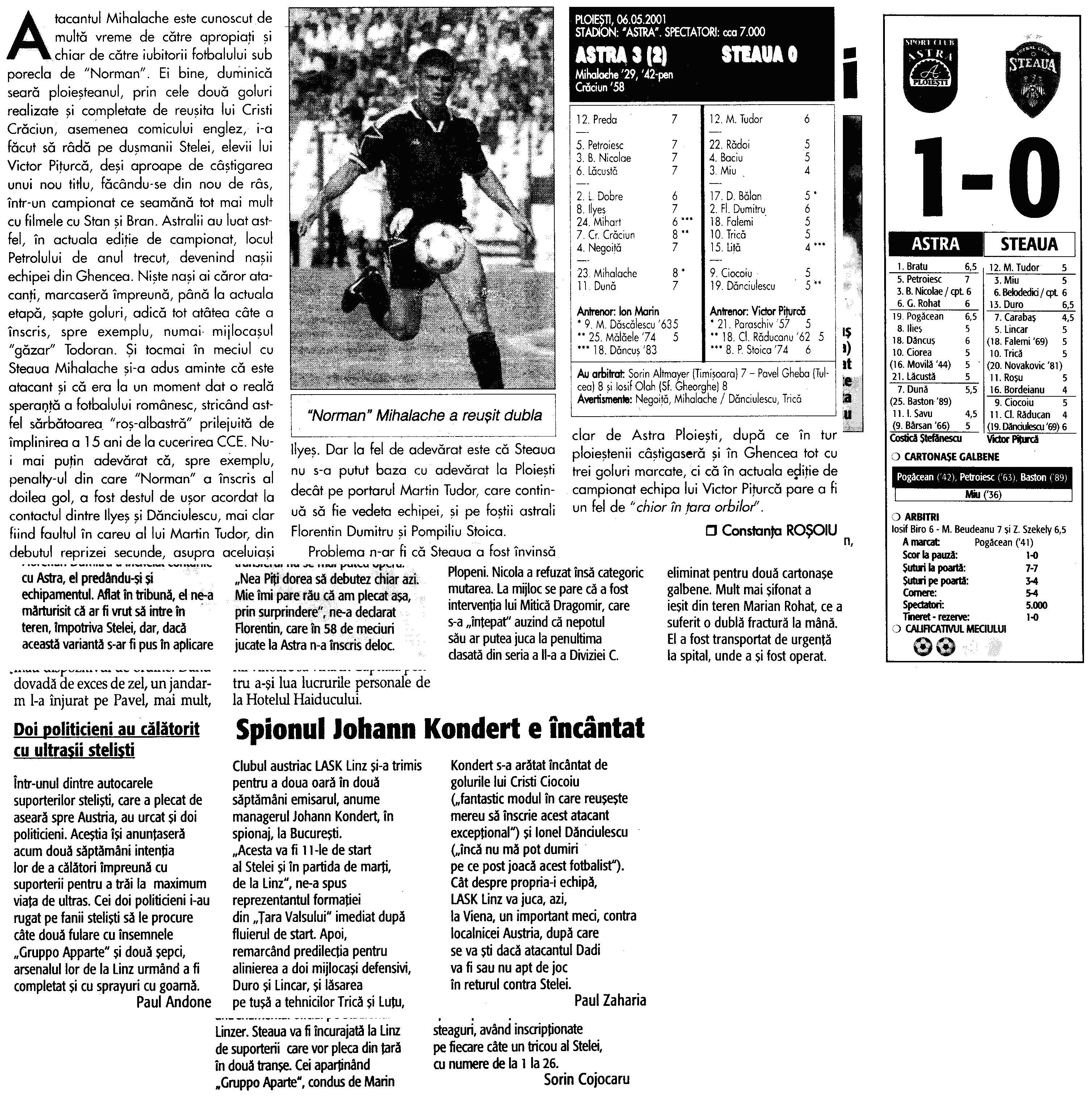 Pana atunci, Astra, sub comanda lui Costica Stefanescu (fost jucator si antrenor obscur la Steaua) si cu Marin Duna, Robert Ilies, portarul Bratu si Bogdan Nicolae, in axul central, a propus, in 5 aprilie 2000, un joc defensiv bine pus la punct, blocand punctele forte ale Stelei, inscriind un gol prin Pogacean, in minutul 42, si mentinand rezultatul pana la final.