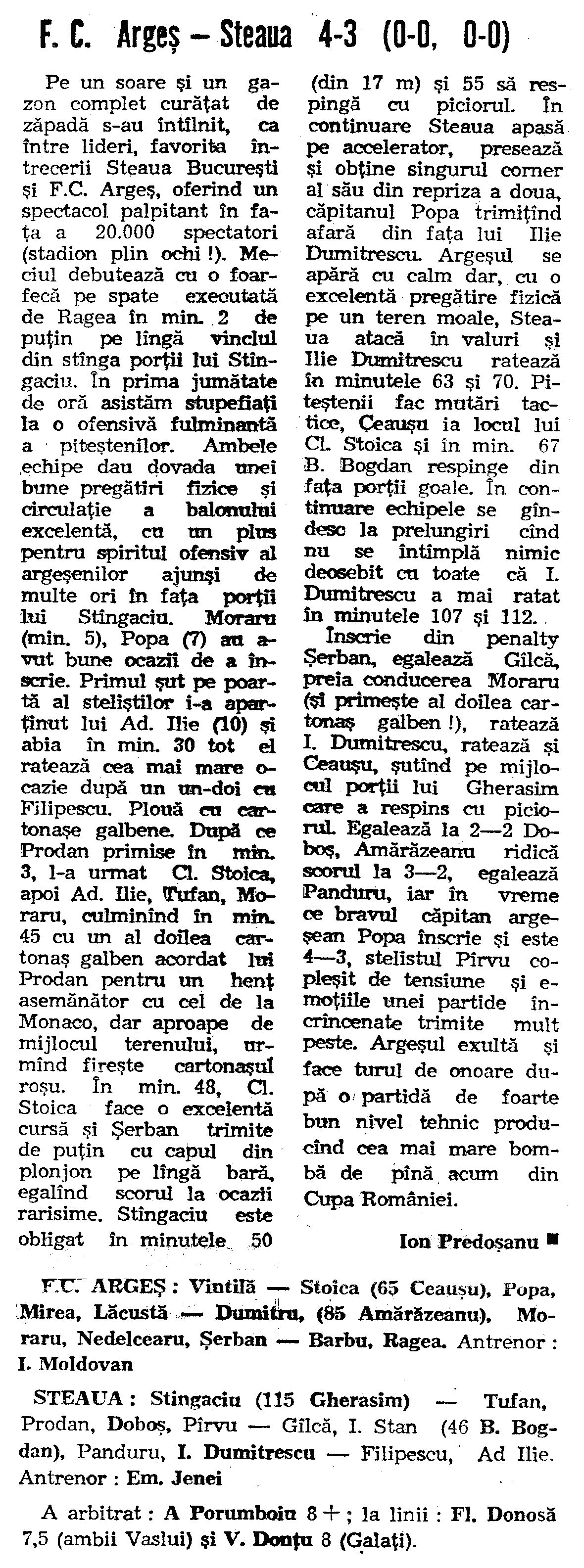 Finala este descrisa de Ioan Chirila ca fiind „letargica”, raportul suturilor spre poarta (24-10), al celor pe poarta (8-4) si al cornerelor (8-2), toate in favoarea Stelei, indicand dominarea covarsitoare a echipei militare, chiar in conditii de joc de vacanta, caldura „sufocanta” punandu-si si ea amprenta pe calitatea jocului.
