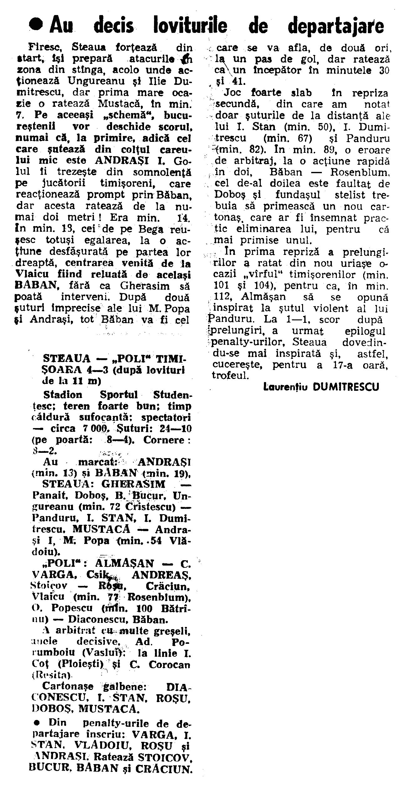 Ilie Stan, Vlădoiu si Andrasi au inscris (Bucur Bogdan a ratat) pentru Steaua, in timp ce pentru adevarata Poli, au inscris Varga si Rosu, suturile lui Baban, Craciun si Stoicov fiind parate de Gherasim, aflat intr-o stare de excelenta pe care o va repeta, peste ani, in Corsica.