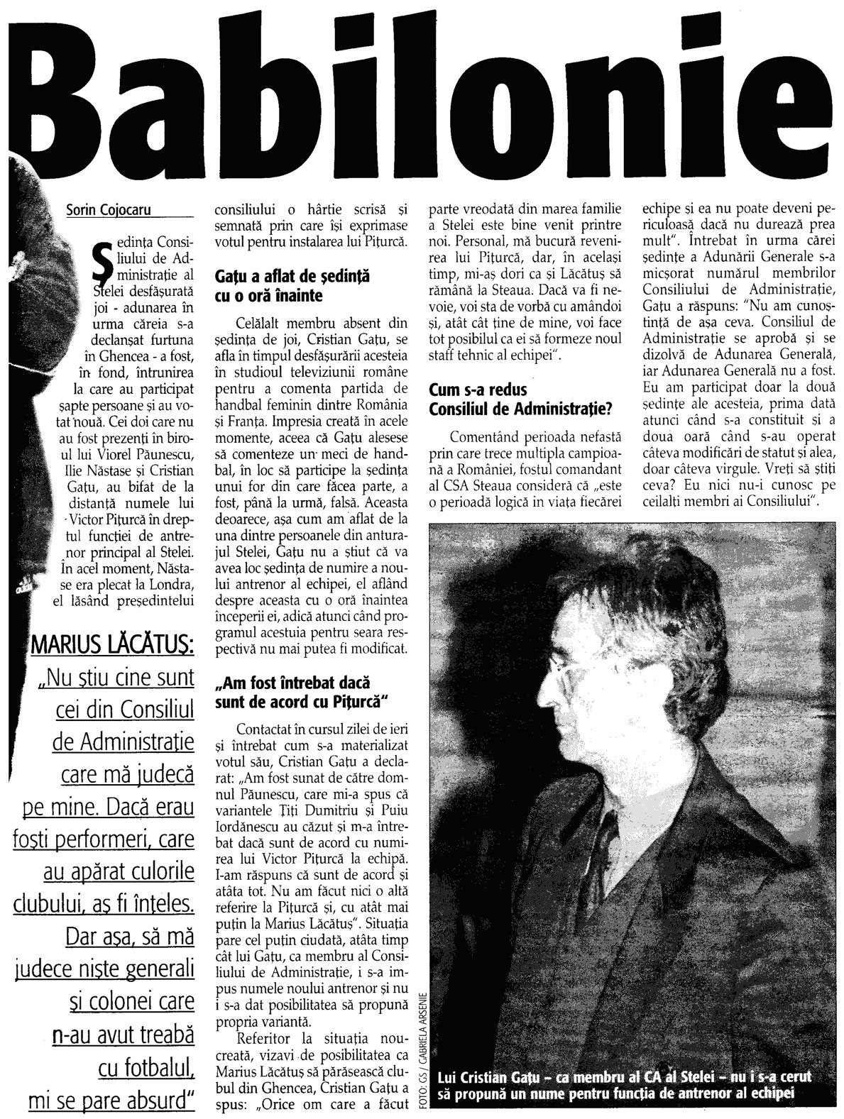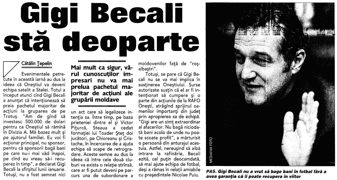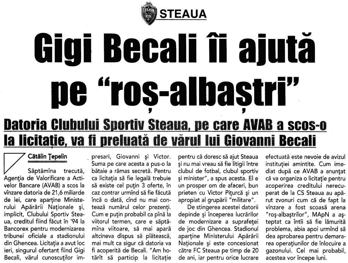 Ei, si cine anume a profitat de babilonia de existenta la club in anii 1998 - 2000 ? Exact un oarecare Jiji Becali. De-aia a si fost tolerat de marea masa de stelisti. Pentru ca oamenii vroiau ca gasca de profitori condusa de Paunescu sa si-o ia peste bot. Asa cum marea masa de stelisti si-ar dori acum ca gasca de profitori condusa de Jiji sa si-o ia peste bot. Situatia e exact aceeasi. Un grup de capuse incep sa distruga clubul, deci trebuie sa plece. Faptul ca suporterii au avut dreptate a fost confirmat ulterior, atunci cand echipa s-a redresat, a castigat 3 titluri in 6 ani, a ajuns in semifinalele Cupei UEFA si in grupele CL. O repetare a acestei performante nu e posibila decat daca gasca de profitori condusa de Jiji isi ia bagajele si pleaca asa cum a plecat si gasca lui Paunescu.