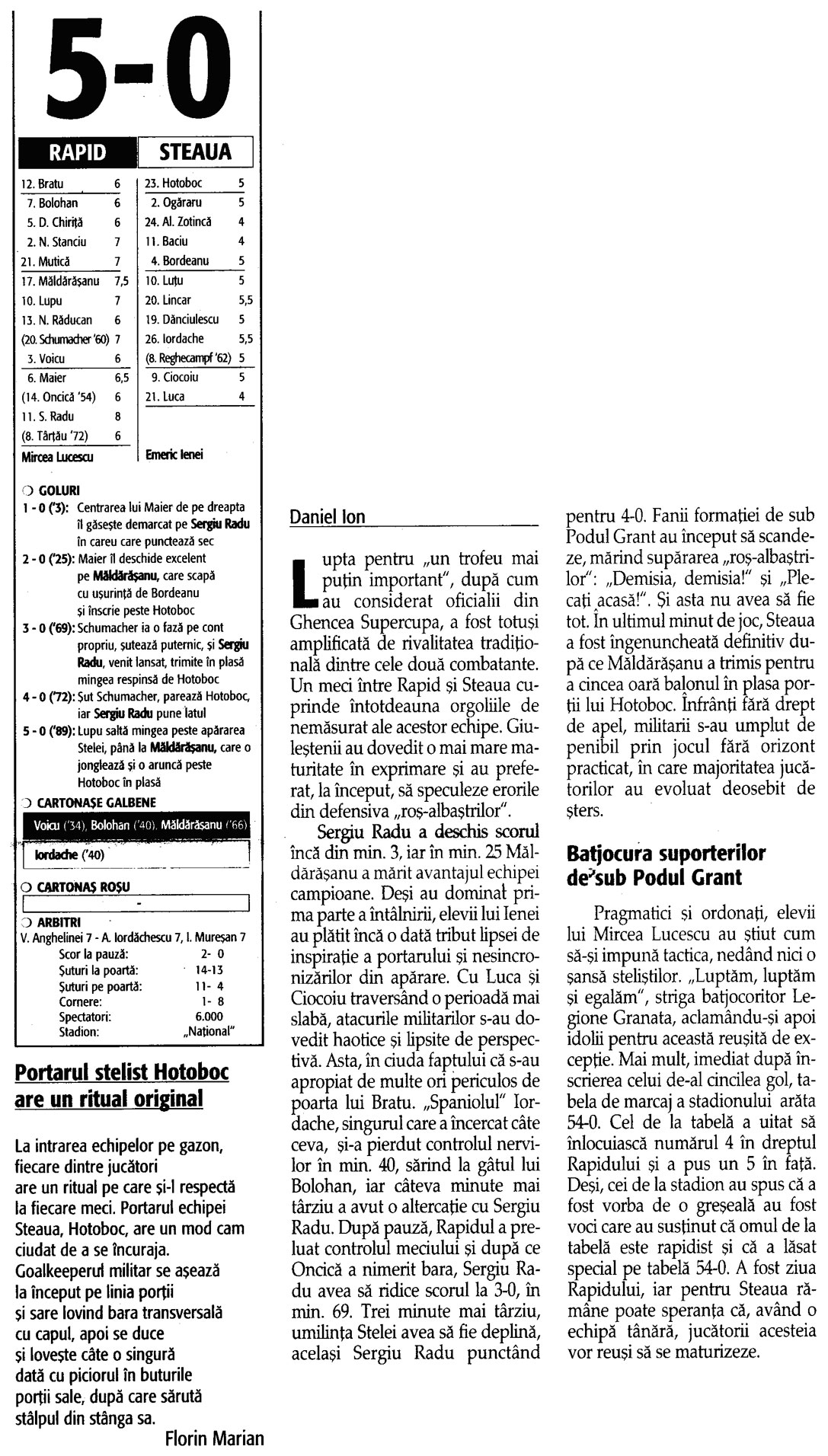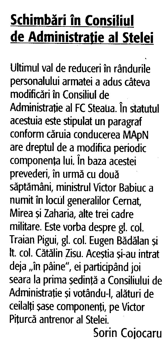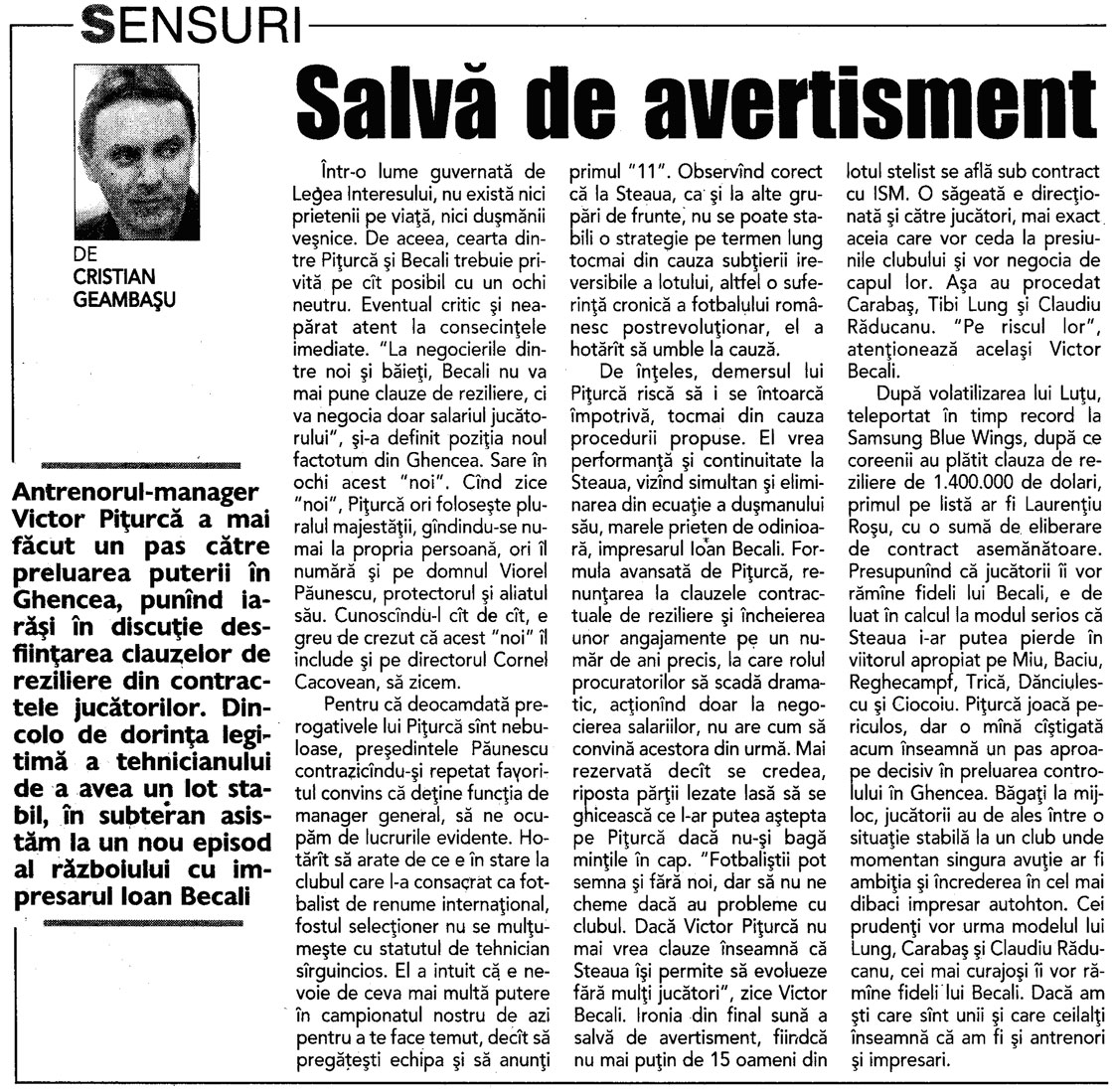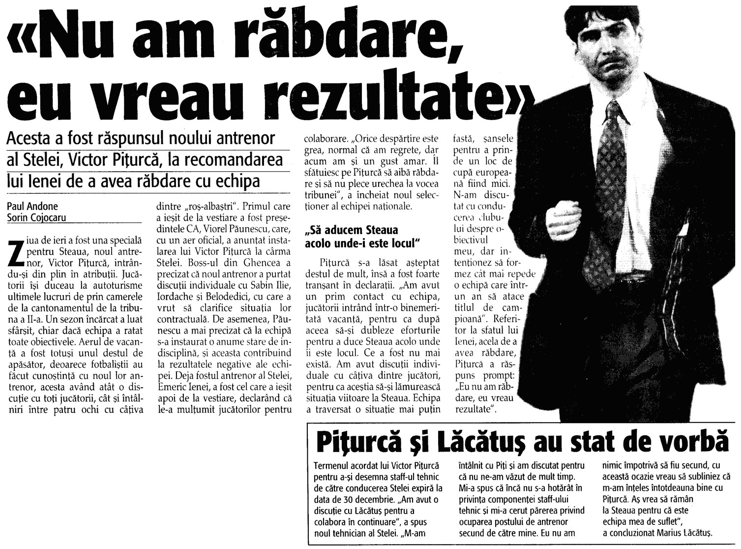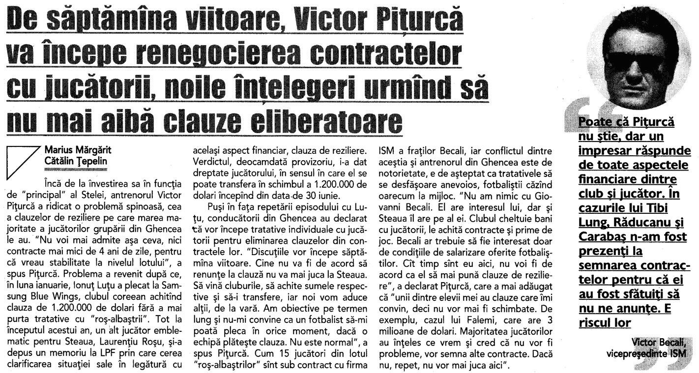 Steaua - de la MApN la Becali (8)Apare Piţurcă! Hop şi Becali!Recapitulăm (încă o dată): a) În aprilie 1998 Secţia de Fotbal se desprinde de Clubul-Mamă. b) În iunie 1998 are loc prima şedinţa a Adunării Generale, iar în decembrie 1998 are loc a doua şedinţă a Adunării Generale, în care, în mod abuziv, Viorel Păunescu impune cotizaţia de 1200 de dolari, pentru a păstra calitatea de membru. Din cei 87 de membri constitutivi (+7 în şedinţa din iunie), rămân doar 21, aceasta fiind lovitura prin care Păunescu preia în totalitate controlul clubului. c) În 7 martie 1999, Ministerul Apărării Naţionale hotărăşte, prin Protocolul bazat pe Hotărârea de Guvern nr. 66 din 4 februarie 1999 a „transmite dreptul de folosinţă gratuită pentru spaţiile şi terenurile destinate activităţilor sportive aflate în administrarea sa către Asociaţia Fotbal Club Steaua pe o perioadă de 20 de ani”. Viorel Păunescu preia clubul în primăvara lui 1998 şi câştigă, cu chiu – cu vai, campionatul 1997-1998. În acel moment Steaua avea şase titluri consecutive. Prima mişcare „managerială”: vânzarea lui Dennis Şerban, din care se trăieşte sezonul următor. Mâna lui Păunescu se vede imediat, deşi n-a reuşit să piardă primul sezon, nereuşind –în 4 luni – să strice munca din tur. În sezonul 1998-1999, însă, Păunescu era la conducere de la început şi anul este dezastruos. În iarnă, Steaua lui Păunescu era la 10 puncte sub liderul Rapid, având cea mai slabă clasare din ultimii 17 ani! La sfârşitul campionatului, Steaua termina pe 3, la 23 de puncte în spatele Rapidului. Începutul sezonului 1999-2000 vine cu promisiuni de mărire din partea lui Păunescu: „ Suntem o echipă pentru Mileniul III”. Steaua are un tur şi mai dezastruos decât precedentul: locul 7, golaveraj negativ, minus patru (-4) la „adevăr”, umilinţe răsunătoare, 19 puncte în spatele liderului Dinamo. ![]() Emerich Jenei este demis (se încetează colaborarea). Plecarea domnului Jenei a îndoliat toată suflarea stelistă, la începutul sezonului, domnia sa sacrificând o amărâtă de Supercupă (pierdută cu 5-0 în faţa Rapidului lui Lucescu), pentru că avea treabă acasă, la Oradea. Îl inundase cineva… ![]() ![]() În locul maestrului Jenei, avansat la naţionala, ca selecţioner de imagine, la Steaua a fost adus Victor Piţurcă, Păunescu fiind cel care a realizat mutarea. Odată cu Piţurcă, în anturajul Stelei este din ce în ce mai vizibil „vărul fraţilor Becali”, cel care era un fel de finanţator-sponsor pe la Gloria Buzău, cochetând şi cu FC Oneşti (din motivele pe care le va recunoaşte peste 10 ani – „voiam o intrare la RAFO” ). După tristeţea mandatului Jenei, Piţurcă venea cu un suflu nou, reformând managementul sportiv al clubului şi dând ceva speranţe pentru viitor. Eliminarea clauzelor de reziliere era principala luptă pe care o ducea, iar asta a prins şi la public. După returul campionatului 1999-2000, Steaua lui Piţurcă săltase de pe locul 7, golaveraj negativ, cu -4 la „adevăr”, la 19 puncte în spatele liderului, unde se afla la finele turului, pe locul 4, cu +6 la „adevăr”, distanţa de lider mărindu-se la 27 de puncte, dar reducându-se faţă de media grupului echipelor fruntaşe. Piţurcă a disponibilizat 11 jucători şi a adus 10. Formula-tip a lui Jenei : Ritli – Reghecampf, Baciu, Miu, Bordeanu – Dănciulescu, Duro, Linkar, Roşu – Lăcătuş, Sabin Ilie, a fost remaniată total de noul antrenor: Martin Tudor – Florentin Dumitru, Belodedici, Rădoi, Pompiliu Stoica – Carabaş, Linkar, Trică – Dănciulescu – Vlădoiu, Ciocoiu. Prin activarea clauzelor pentru Luţu şi Roşu, Steaua ieşea, la finele operaţiunilor plecări-veniri, cu un profit de peste 1 milion de dolari (bani suficienţi pentru contractele şi impozitele a vreo 11-12 jucători de bază ai lotului). Şi, pentru că toate mergeau bine şi Steaua se repusese pe picioare, încă o veste bună a gâdilat urechile steliştilor în vara lui 2000. Vărul fraţilor Becali era dispus să-i ajute pe roş-albaştri, pentru că nu mai voia „să fie litigii între Clubul Sportiv şi Minister.” Astfel, creanţa de 21, 6 de miliarde a CS Steaua, către AVAB (Agenţia de Valorificare a Activelor Bancare), urma să fie PRELUATĂ de vărul lui Giovani Becali. În vara lui 1999, Gigi Becali era descris publicului ca „un prosper om de afaceri, bun prieten cu Victor Piţurcă şi apropiat al grupării militare.” Din momentul ăla, CS Steaua n-ar mai fi fost datoare la o Instituţie a Statului Român, ci ar fi fost la mâna unei persoane fizice, venită din tenebrele Piperei şi ridicată, în perioada 1996-1999, şi pe nişte serii de operaţiuni, legături şi contracte încheiate cu reprezentanţi ai Statului Român. Culmea, operaţiuni în dezavantajul cras al Statului şi culmea, cu reprezentanţi ai aceleeaşi Instituţii, care era acum salvată, prin intenţia de preluarea a datoriei către AVAB, de apropiatul grupării militare. Filip Pindean BIBLIOGRAFIE OBLIGATORIE: Steaua - de la MApN, la Becali (1) Steaua - de la MApN, la Becali (2) Steaua - de la MApN, la Becali (3) Steaua - de la MApN, la Becali (4) Steaua - de la MApN, la Becali (5) Steaua - de la MApN, la Becali (6) Steaua - de la MApN, la Becali (7) FCSTEAUA.RO este un site deschis, facut de suporteri, pentru suporteri. Asteptam articolele scrise de voi, daca aveti ceva de spus si credeti ca o puteti face intr-un articol, nu ezitati!