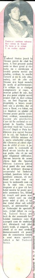 CĂPITANUL STELEITudorel Stoica s-a născut pe 7 septembrie 1954, la Brăila. A început fotbalul la Politehnica Galaţi, unde a şi debutat la seniori, în B, în sezonul 1971-1972. Locul 4 ocupat de Poli Galaţi în sezonul de debut al lui Tudorel (4 meciuri, la 17 ani), a fost urmat de o salvare în extremis de la retrogradare în sezonul 1972-1973 (locul 16, cu 22 de meciuri pentru mijlocaşul de 18 ani), cu CSU Galaţi, şi un loc 11 în sezonul 1973-1974 (30 de meciuri, la 19 ani), cu aceeaşi CSU.Remarcându-se prin consistenţa şi constanţa anului încheiat, a fost transferat din postura de jucător provincial de perspectivă (aflat la vârsta încorporării) de către Steaua, a făcut pregătirea de vară cu echipa, însă a fost cedat echipei-fanion a oraşului Galaţi – divizionara A, FCM Galaţi (Oţelul de azi) –, pentru care a evoluat în doar 4 meciuri în tot sezonul 1974-1975 (cel puţin aşa spun statisticile), din motive neclare. Cert este că în unele statistici, apare în lotul cu care Steaua începea sezonul. La finele acestui an, 1974-1975 (FCM retrogradează de pe ultimul loc), Tudorel Stoica este readus la Steaua, care terminase sezonul pe locul 5 (după campioana Dinamo, ASA Târgu-Mureş, U. Craiova şi Sportul) şi fusese scoasă din Cupă încă din optimi de către Poli Timişoara. Cuplul de antrenori din sezonul încheiat (Constantin Teaşcă, secondat de Gheorghe Constantin) fusese înlocuit de o figură istorică a CCA-ului, Emerich Jenei (secondat de Carol Creiniceanu), aflat la primul mandat de principal pe banca Stelei, după ce în a doua parte a lui 1972-1973 fusese secundul lui Constantin. Şansa lui Tudorel a fost Jenei. Nea Jmi se vedea – cel mai probabil – pe el, în urmă cu 20 de ani, în harnicul şi nespectaculosul mijlocaş venit de pe Dunăre. Acelaşi stil preocupat, chiar sobru, conştiincios, care asigura consistenţa de la mijlocul terenului (parcă, cu un pic de energie în plus la Tudorel). Cum la Steaua ceilalţi mijlocaşi centrali, marile vedete, nu doar ale echipei militare – Liţă Dumitru şi Iordănescu –, nu prea aveau obiceiul să piardă vremea prin terenul propriu, Tudorel s-a potrivit la fix pe poziţia de om care stă de veghe, la acoperire, în timp ce trio-ul Dumitru-Iordănescu-Răducanu, era în spatele, sau chiar lângă un Năstase, Troi sau Zamfir. În acel moment, la 21 de ani neîmpliniţi, cu doar 4 meciuri în A, Tudorel Stoica devenea titular lângă nişte monştri sacri ai fotbalului românesc. Steaua îşi câştiga reperul pentru următorul 15 ani. În primul sezon sub Jenei, în primul sezon cu Tudorel, Steaua câştigă campionatul după o pauză de 7 ani, chiar în mare stil, cu 7 puncte peste Dinamo. Cele 16 meciuri şi 2 goluri, ale lui Tudorel, nu se compară cu cele 32 de meciuri ale lui Zamfir, 31 ale lui Iordănescu sau Sameş, cele 23 de goluri ale lui Iordănescu, sau cele 17 ale lui Marcel Răducanu, dar Dumitriu IV simţea că e ultimul sezon ca titular în linia de mijloc. În acest sezon, Tudorel şi-a câştigat postul pentru următoarele multe sezoane. Steaua câştigă şi Cupa, trecând în finală de CSU Galaţi cu 1-0. Sezonul 1976-1977 îl consacră pe Tudorel ca titular. Are 26 de meciuri şi 3 goluri, într-o linie mediană cu Dumitru şi Iordănescu (1-4-3-3), cu rezerve precum Ion Ion, Aelenei şi Florea. Steaua ratează titlul în faţa lui Dinamo şi pierde şi finala Cupei, în faţa Universităţii Craiova. Sezonul 1977-1978 înseamnă o contribuţie consistentă la câştigarea campionatului. Tudorel are 28 de meciuri şi 1 gol, fiind un permanent garant al siguranţei. Gabi Zahiu apare şi el, ca o varianta bună, la absenţe mediene. Echipa-tip: Iordache – Anghelini, Fl.Marin, Sameş, Vigu – Dumitru, Stoica, Iordănescu – Troi, Năstase, Răducanu. Sezonul 1978-1979 înseamnă instalarea lui Gheorghe Constantin (secundat de Vasile Zavoda) ca principal, Jenei fiind mazilit după ce câştigase 3 trofee în 3 ani cu o echipă care era obişnuită să nu câştige. Steaua ratează titlul, la 5 puncte sub Dinamo, dar câştigă Cupa, într-o finală cu Sportul studenţesc. Stoica joacă în 29 de meciuri, înscriind 3 goluri. Pe 14 octombrie 1979, Tudorel debutează la naţională, într-un URSS–România 3-1, fiind convocat de Cernăianu, aflat, şi el, la primul meci pe bancă, succedându-i lui Pişti Kovacs. Tudorel a intrat în minutul 61, în locul lui Ilie Balaci. România: Cristian Gheorghe – Tilihoi, A.Nicolae, Păltinişanu, Ion Munteanu – Balaci, Dinu, Boloni – Cârţu, Cămptaru, Răducanu. Sezonul 1979-1980 înseamnă 26 de meciuri şi 5 goluri. Steaua pierde în mod antologic campionatul, la egalitate de puncte (44) în faţa Universităţii Craiova şi pierde în mod la fel de antologic şi Cupa, într-o finală cu Poli Timişoara. Sezonul 1980-1981 dă startul la 3 ani de căutări (chipurile), practic o nebunie din care nu s-a ieşit decât prin implicarea lui Ion Alecsandrescu. Stoica joacă 23 de meciuri înscriind 3 goluri. Plaecă Liţă Dumitru şi Vigu, iar Tudorel capătă responsabilităţi sporite. În linia de mijloc a Stelei s-au perindat A. Iliescu, Mateffi, Isaia, Sertov, Lascău, Litan sau Ştefan Popa. Nou-venitul Ştefan Iovan a fost folosit la 2 meciuri pe postul lui Tudorel, împins la construcţie. La naţională, Cernăianu este înlocuit de... Kovacs, care, la primul meci, îi dă 30 de minute lui Tudorel, contra Cehoslovaciei. Pe 10 septembrie, cel care-l înlocuise, între timp, pe Kovacs, Valentin Stănescu, îl titularizează pe Tudorel împotriva Bulgariei, într-un amical câştigat cu 2-1 de noi (Iordănescu şi Beldeanu). România: Iordache – Negrilă, Ştefănescu, Nicolae, Munteanu – Beldeanu, Stoica, Iordănescu – Mircea Sandu, Cămătaru, Ţălnar. Sezonul1981-1982 a fost nu supt patru regi, ci supt patru antrenori: Gh. Constantin, Traian Ionescu, Nicolae Pantea şi Cernăianu. Steaua termina pe