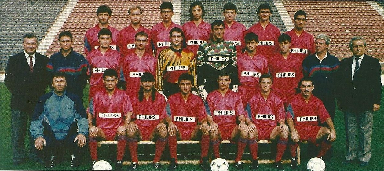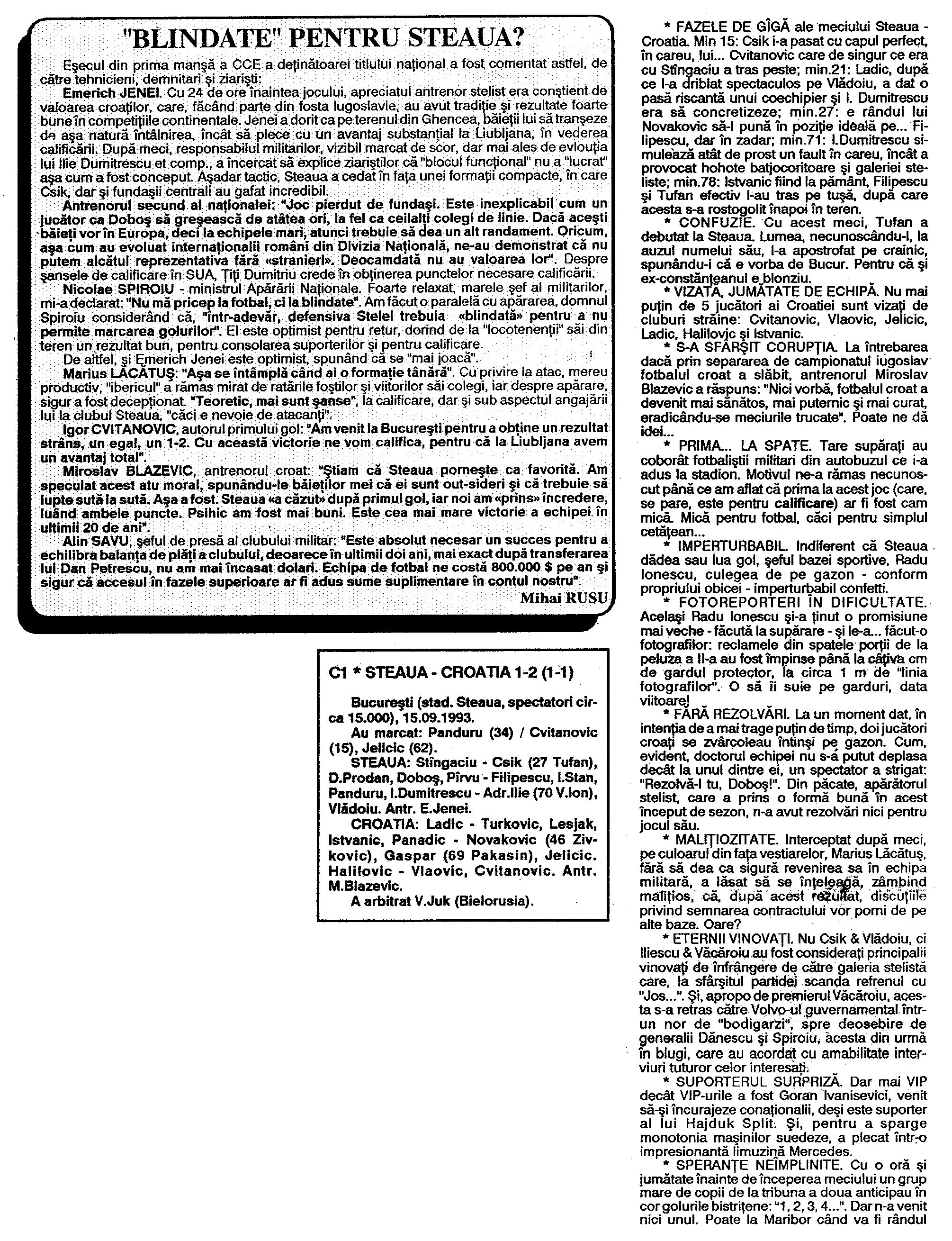 15 septembrie 1976, 1993Pe 15 noiembrie 1976, Steaua era la Brugges, unde o întâlnea pe campioana Belgiei, în turul I al Cupei Campionilor Europeni.Steaua câştigase campionatul 1975-1976, într-un mare stil. Emerich Jenei, la primul sezon pe banca Stelei, adusese primul titlu, după 8 ani, cucerindu-l en fanfare, la 7 puncte peste locul 2, Dinamo şi la 13 puncte peste locul 3, ASA Tg. Mureş. Influenţa principală asupra performanţei îi aparţine, neîndoielnic, lui Jenei, acesta defilând în sezon (a câştigat şi Cupa, primul event după 24 de ani), cu aproximativ acelaşi lot care terminase sezonul precedent, 1974-1975, pe locul 5, cu doi ani in urma, 1973-1974, pe locul 5, în 19772-1973 pe locul 6, în 1971-1972 pe locul 9. Jenei a fost cel care a dat strălucirea Stelei 1975-1976, ridicând-o cu cel puţin o clasă. Astfel, Steaua juca în Cupa Campionilor contra lui Brugge. Adversarii, înfiinţaţi în 1891, aveau o generaţie care va rămâne reper pentru istoria clubului. Până în acel moment, în apropae 90 de ani de existenţă, cuceriseră două campionate, 1919-1920 şi 1972-1973. Ei, campionatul 1975-1976 avea să fie primul din 3 consecutive (1975-1976, 1976-1977, 1977-1978) jumătatea deceniului fiind închisă de alt titlu (1979-1980), obţint de aceiaşi formulă. Peste astea, în 1977-1978 aveau să joace finala Cupei Campionilor, pierdută greu în faţa lui Liverpool, echipa lui Paisley impunându-se la limită, prin golul lui Dalglish, din minutul 65. Nu doar asta, dar pe 30 iunie 1976, atunci când Steaua juca finala Cupei, contra lui CSU Galaţi (1-0), Brugges avea doar o lună de la pierderea, în joc dublă manşă, a finalei Cupei UEFA, împotriva aceleiaşi Liverpool. În prima mansă, de la englezi, Bruges deschidea scorul în minutul 5 şi conducea în minutul 15 cu 2-0, scor cu care şi intraseră la pauză. Şi la ieşire, se părea că se va asista la o mare surpriză, dar cormoranii au revenit în stil propriu, pregătitor milanist, peste decenii, şi au întors scorul în 6 minute: 59, 61, 65 (pen.). Meciul retur părea că începe identic, belgienii deschizând scorul în minutul 11 (pen.). Golul lui Keagen de peste 4 minute, a produs un scor care nu s-a mai schimbat până la final şi care a dus trofeul în Liverpool, dar replica lui Bruges în faţa unei echipe cu Clemence – Neal, Smith, Thompson, Kennedy – Hughes, Keegan, Case, Heighway – Toshak, Callaghan, şi deci, valoare ei, erau dovedite. Astfel, peste 4 luni, învinsa lui Liverpool din finala Cupei UEFA o primea pe Steaua. ![]() ![]() ![]() ![]() ![]() ![]() ![]() Pe 14 septembrie 1976, 17.000 de spectatori au fost prezenţi pe Olympia Stadion din Brugges, începând cu ora 20:00 Club Bruge KV: Birger Jensen – Alfons Bastinjs, Daniel De Cubber, Georges Leeskens, Norbert Denaeghel – Julien Cools, Rene Vandereycken, Paul Courant, Roger Davies – Raoul Lambert, Ulrik Lefevre Antr.: Ernst Happel Steaua: Iordache – Anghelini, Fl. Marin, Sameş, Vigu – Dumitru, Agiu, Iordănescu – Ion Ion, Troi, Răducanu Antr.: Emerich Jenei Meciul a fost echilibrat, Steaua propunând jocul tradiţional de pase prin care deţinea controlul asupra jocului. Sigur, acţiuni foarte periculoase nu am avut, însă permanenta mişcare, cu schimbări variate de poziţie, între componenţii cavaleriei din faţă, versatilii Troi, Răducanu şi Ion, cărora li se adăuga şi Iordănescu, au creat o zumzăială care, odată ţinea mingea departe de careul nostru, a doua oară frustra adversarul. Presingul, din pacate, n-a fost acelasi pe toata durata meciului, fiind combinat cu momente de retragere, în special de la reluare, care au favorizat o presiune pe poarta lui Iordache. Pe acest fond, golul lui Roger Davies, din minutul 51 apare ca firesc, însă el a fost dat gratuit de către arbitrul vest-german Walter Eschweiller. Imediat după golul primit, Steaua are o răbuhnire nervoasă, îşi mută liniile cu 15 metri mai în faţă şi declanşează ce trebuia să declanşeze mai devreme: un joc dezinhibat, în care, ca răspalată a atitudinii, a adus golul egalizator, înscris de Radu Troi, în minutul 60. Au urmat 20 de minute în care echipa noastră a revenit, din păcate, la o prudenţa exagerată, dominaţia la care s-a lăsat supusă, prin retragerea deliberată, fiind pedepsită de golul victoriei belgiene, gol înscris de nou-intratul Bernard Verheecke în minutul 81. După un meci deloc rău, în care a ţinut piept unei echipe a momentului în Europa, Steaua se întorcea la Bucureşti cu amărăciunea unui joc din care se putea obţine mai mult şi cu speraţa dată de un joc care, în multe momente, a dominat tactic şi tehnic, finalista Cupei UEFA. Returul – peste 2 săptămâni, la Bucureşti. ![]() La 15 septembrie 1993, Steaua juca împotriva campioanei Croaţiei, Croaţia Zagreb în turul I a ceea ce era a doua ediţie de Champions League şi avea să devină o formulă intermediară, de la sistemul eliminator la cel cu grupe, ediţia prezentă disputându-se sub formula a II tururi (pe lângă cel cel preliminar), apoi a două grupe de câte 4, în care fiecare joacă cu fiecare, iar primele 2 din fiecare grupă joacă cele două semifinale. Steaua câştigase titlul, după 3 ani de pauză, Dinamo (de două ori) şi Universitatea Craiova întrerupând temporar dominaţia stelistă (deşi cu mari asperităţi morale, la cel puţin primul titlu al lui Dinamo şi la cel al Craiovei). ![]() Ion Alecsandrescu nu stătuse degeabă şi făcuse exact ce făcuse în urmă cu un deceniu – construise o echipă care să domine fotbalul românesc pentru vreo 5 ani. Problema se punea la ce nivel avea să o confirme în cupele europene, iar meciul contra unei echipe excelente a Croaţiei Zagreb (probabil cea mai bună din istorie), avea să fie parte a răspunsului. Aşadar, pe 15 septembrie 1993, în Ghencea, de la ora 20:00, 15.000 de spectatori erau alături de Steaua lui Jenei (i