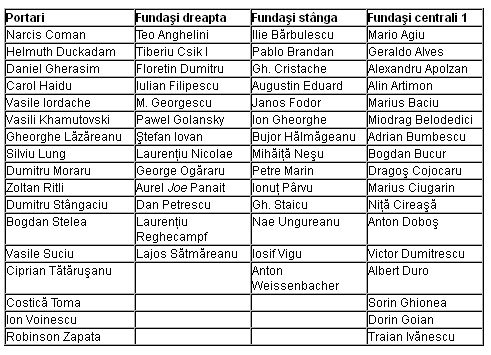 Rezerve: Iordache, Sorin Tufan, Tibi Curt, Smarandache, Prodan, Stelian Carabas, Costel Galca, Basarab Panduru, Dorel Zamfir, Catalin Munteanu, Mugurel Cornateanu, Iosif Rotariu, Ionel Danciulescu, Gabi Raksi, Viorel Nastase