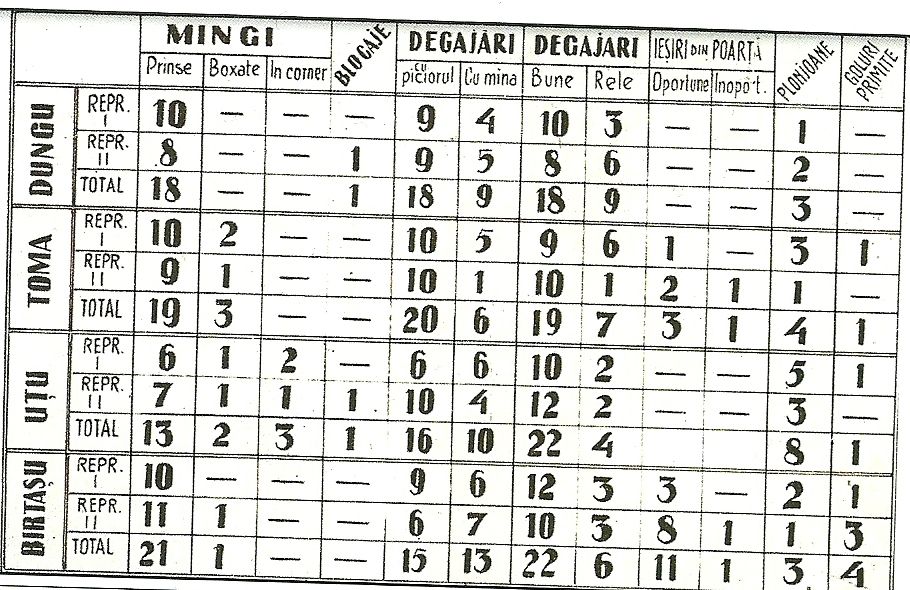 Deşi, veţi observa, tabelul (click pe el pentru a-l mări) e destul de naiv, şi criteriile sunt chiar diferite, de la portar la portar, Costică Toma s-a clasat al doilea. De asemenea, cu scuzele de rigoare, nu ştiu dacă tabelul cuprinde doar cifrele unui singur meci de fiecare (foarte probabil, sunt evaluări dintr-o etapă fixă), sau este o medie a evaluărilor pe parcursul întregului campionat. Deci, Toma e de la CCA, Uţu e de la Dinamo, Dungu de la Rapid, iar Birtaşu e de la Progresul. În rest, să-l înţeleagă cine poate.
