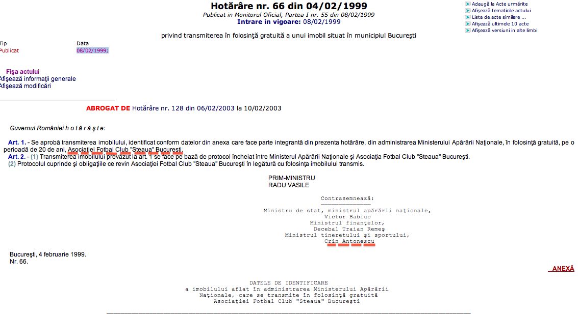 În 1999, Crin Antonescu era ministru al Tineretului și Sportului. În calitatea asta, a contrasemnat HG (hotărîre de guvern) 66 din 4 februarie 1999, prin care stadionul Ghencea era dat în folosință gratuită Asociației Fotbal Club “Steaua” București (AFCSB). La vremea aia, AFCSB era, cum îi zice și numele, o asociație condusă de Viorel Păunescu, dar finanțată de Gigi Becali, patronul de facto al clubului. În 2003, Becali a preluat cu totul Steaua, devenind proprietar de drept (apoi, prin 2005, a cedat acțiunile clubului nepoților lui). Tot în 2003, premierul Adrian Năstase, fan dinamovist, a anulat hotărîrea de guvern contrasemnată de Antonescu și stadionul Ghencea a revenit la Ministerul Apărării.