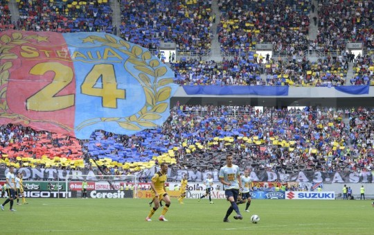 28-05-13 STEAUA - FC Brasov 4-0 FOTO & VIDEO / Reghecampf i-a dedicat titlul AluiaSteaua Bucureşti a învins pe FC Braşov cu scorul de 4-0 (2-0), marţi seara, pe Arena Naţională, în uvertura etapei a 34-a, ultima a acestui sezon al Ligii I de fotbal, în care ''roş-albaştrii'' au cucerit titlul de campioni naţionali.Steaua a început în trombă şi conducea cu 2-0 după şapte minute, în urma reuşitelor lui Raul Rusescu (2) şi Lukasz Szukala (7). Jucătorii stelişti au etalat coregrafii diferite la gol, la primul efectuând un dans, cu Latovlevici în prim plan, iar la al doilea ''roş-albaştrii'' au fost pe post de popice. O coregrafie deosebită au reuşit să fanii, în tribune, alcătuind harta României, jumătate roşie, jumătate albastră, iar în centru numărul 24, al titlurilor cucerite de Steaua. Antrenorul Laurenţiu Reghecampf l-a retras simbolic de pe teren pe golgheterul Raul Rusescu (21 de goluri în acest sezon), în minutul 24 al partidei, atacantul având şi el numărul 24 pe tricou, număr care reprezintă şi titlurile adunate de Steaua. Steaua a marcat şi al treilea gol, după pauză, prin muntenegreanul Stefan Nikolic (56). Adrian Popa (87) a marcat golul al patrulea al Stelei, dar în proporţie de 99 la sută reuşita îi aparţine lui Cristian Tănase. FC Braşov a avut o bară, prin ex-dinamovistul Georgian Păun (66), jucător care a fost ţinta unor obiecte aruncate din tribune de fani la un corner pentru oaspeţi. La meci au asistat peste circa 50.000 de spectatori. După meci, jucătorii şi membrii staff-ului Stelei vor primi medaliile şi trofeul de campioni ai României, pe Arena Naţională, după care vor sărbători alături de suporteri în Piaţa Constituţiei câştigarea celui de-al 24-lea titlu (1951, 1952, 1953, 1956, 1959-1960, 1960-1961, 1967-1968, 1975-1976, 1977-1978, 1984-1985, 1985-1986, 1986-1987, 1987-1988, 1988-1989, 1992-1993, 1993-1994, 1994-1995, 1995-1996, 1996-1997, 1997-1998, 2000-2001, 2004-2005, 2005-2006, 2012-2013). Circulaţia rutieră a fost restricţionată marţi, între orele 20,30 - 23,30, pe Bulevardul Unirii, între Bd. I. C. Brătianu şi Piaţa Constituţiei, precum şi între Bulevardul Libertăţii, Bulevardul Naţiunile Unite şi Calea 13 Septembrie. Agerpres "Ce mai pot spune, este ceva incredibil. Mă bucur enorm că am avut atîţia spectatori lîngă noi. Ne pare rău că a lipsit cineva, că nu e lîngă noi. Îi dedic titlul lui Gigi Becali. Lui, familiei, celor 3 fete, soţiei, mamei. Ne pare rău că nu este lîngă noi, îi dedicăm lui acest titlu. Este greu să ne bucurăm, dar trebuie să facem asta pentru oamenii care ne iubesc, care au venit la stadion. Este ceva incredibil cîtă lume ne iubeşte. Au arătat-o la fiecare meci în acest sezon, în meciurile din Europa", a spus dupa meci antrenorul Laurenţiu Reghecampf. Fiecare jucător al Stelei a avut un tricou special pentru cîştigarea titlului, cu mesajul în "Victory" şi mare cu cifra 24, adică numărul de campionate obţinute în Liga 1. De asemenea, în locul literei "o" din mesaj era stema roş-albaştrilor. Steaua este campioanã cu cele mai multe puncte din ultimii 13 ani, ultima echipa care a cucerit titlu cu mai mult de 79 de puncte a fost Dinamo 99/2000 - 84 puncte. Al 24-lea titlu dupã 7 ani. Interesant este faptul cã şi marea echipã din anii 80 a cucerit campionatul tot dupã o pauzã de 7 ani, 1978-1985. Steaua a încheiat campionatul cu cea mai bunã apãrare din Liga 1. De asemenea, Steaua este echipa cu cel mai bun atac din ultimii 13 ani, precedentul cînd o echipa a marcat peste 74 de goluri a fost în 99/2000 - Dinamo - 93 goluri. Nici o echipa nu a luat mai mult de 3 puncte Stelei în acest sezon. Singura care are un golaveraj pozitiv cu "ros-albaştrii" în stagiunea curentã este Vaslui (victorie cu 3-1 tur / infrîngere 0-1 retur). 31 de jucãtori au evoluat pt Steaua în cele 34 de etape. 6 din cei 31 sunt straini. "Ros-albastrii" au avut doar doi debutanţi in Liga 1, Georgievski si Cojocaru. 16 din cei 31 de jucatori au marcat cel putin un gol în sezonul curent. Rusescu este singurul jucãtor din lotul Stelei care a bifat prezenţe în toate cele 34 de etape pt bucureşteni. Dupã 6 ani, titlul a revenit în Bucureşti, ultima campioanã datã de Capitalã fiind Dinamo, în sezonul 2006/07. În total, cel mai mare oraş al României a cîştigat de 60 de ori campionatul, pe locul 2 aflîndu-se Timişoara, cu 10 titluri. Steaua a obţinut al 50-lea trofeu intern, cifrã record pentru fotbalul românesc. Pe locul 2 se aflã Dinamo, 33 de trofee. În total, gruparea "roş-albastrã" a strâns 52 de trofee. Reghe este al 15-lea antrenor care a cucerit titlul de campion cu Steaua. 10 din cei 15 au bifat toate meciurile din sezonul respectiv. Reghe este primul antrenor dupã Olãroiu care a contabilizat toate meciurile pe banca Stelei într-un sezon. Reghecampf este singurul antrenor din istoria Stelei care a cîştigat titlul din primul an şi ca jucãtor şi ca antrenor. Golul marcat de Rusescu în minutul 3 a consemnat o nouã bornã în cariera atacantului stelist. Acesta a ajuns la 50 de goluri în Liga 1, cifrã pe care nu o mai întîlnim la nici-unul din actualul lot al Stelei. Doar 3 jucători din cei care au evoluat în acest an pt Steaua au mai cîstigat titlul în Liga 1: Rîpă, Rusescu şi Tibi Bălan. Cel mai experimentat jucător din lotul actual al Stelei după numărul de meciuri este Andrei Prepeliţă - 261 jocuri partide în Liga 1. Gazeta Sporturilor Momentul de sărbătoare al Stelei, care a sărbătorit marţi titlul cu numărul 24 din istorie, nu a însemnat şi stingerea conflictelor mai vechi dintre o parte a galeriei şi conducere. Festivitatea de premiere de la finalul meciului cu FC Braşov (4-0) a durat aproximativ o oră, timp în care au fost prezentaţi toţi oamenii care au contribuit la performanţa din acest sezon, de la şoferul autocarului până la jucători şi
