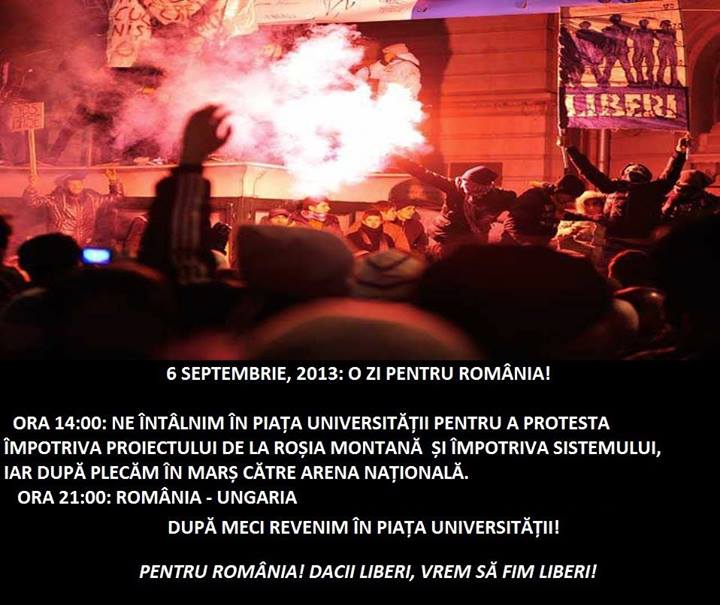 La ora 14:00 ne intalnim in Piata Universitatii pentru a protesta impotriva jafului ce se pregateste la Rosia Montana. La ora 19:00 ne indreptam cu totii spre stadionul National pentru meciul Romania-Ungaria. Dupa terminarea meciului mergem inapoi la Universitate pentru a continua protestul.