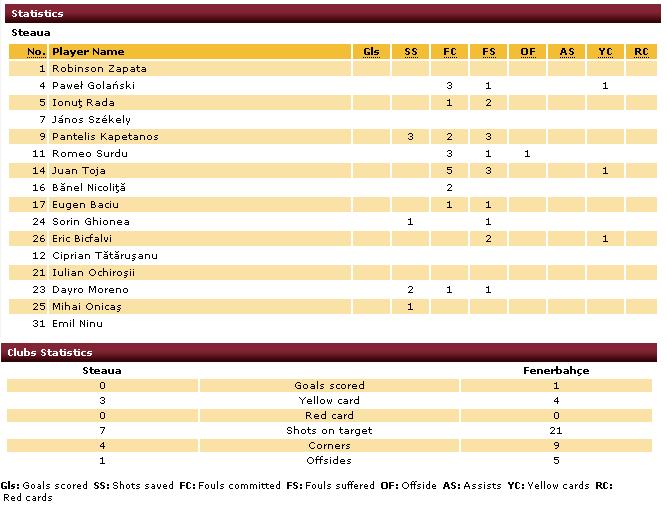 Steaua Bucuresti - Fenerbahce Istanbul 0-1 (0-0)Steaua venea la meciul din aceasta seara cu un palmares pozitiv din intalnirile cu turcii, echipa ros-albastra nepierzand nici un meci cu echipele din tara semilunei. Asta pana azi. Fenerbahce a venit in Ghencea fara vedetele Alex, Deivid sau Guiza, a cautat victoria, a luptat si a gasit-o. Steaua - Fenerbahce 0-1.Zapata - Golanski, Ghionea, Baciu, Rada - Szekely, Bicfalvi, Toja, Nicolita - Surdu, Kapetanos Prima ocazie a meciului a apartinut Stelei. In minutul 9, Kapetanos a scapat pe dreapta si, dupa o cursa, a tras pe langa poarta. A fost momentul in care Fenerbahce s-a hotarat sa iasa la joc. A inceput dominarea turcilor, stelistii multumindu-se cu jocul pe contraatac. Portarul Zapata a fost din nou omul meciului pentru Stelisti. Columbianul a fost un zid in poarta Stelei, reusind interventii importante in minutele 26, 30, 32 si 34. Pentru a opri dominarea lui Fenerbahce, "Limbi" face prima schimbare in minutul 41. Bicfalvi a fost inlocuit cu Onicas si, surprinzator, Steaua se trezeste si reuseste o scurta dominare finalului de repriza, Surdu ratand o ocazie mare in minutul 45. Kapetanos si Golanski au lucrat pe dreapta, grecul a primit mingea, a intrat in careu, a centrat iar Surdu a luftat de la 11 metri. Prima ocazie a reprizei secunde apartine tot Stelei. Kapetanos scapa din nou singur spre poarta, e ajuns din urma de Gokhan, fundasul turc loveste mingea si e aproape de autogol. Zapata e din nou inger pazitor in minutele 53 si 56 insa, in minutul 59, turcii reusesc sa deschida scorul. Roberto Carlos primeste o pasa pe culoar, inainteaza, centreaza pe jos, in fata portii, pana la Kazim si atacantul cu cetatenie Britanica inscrie fara probleme. 1-0 pentru Fenerbahce. Steaua raspunde imediat si, in minutul 66, Kapetanos trimite spectaculos, cu capul, in transversala portii lui Volkan. Stoichita muta din nou si face a doua si ultima(!) schimbare. A fost, evident, schimbat Szekely, omul din pasele caruia au iesit cateva din cele mai periculoase actiuni ale ros-albastrilor, in locul lui intrand Dayro, Nicolita trecand pe dreapta. Intrarea lui Dayro nu a adus nici o schimbare. Columbianul a aratat ca e tehnica, a trimis un sut pe poarta dintr-o lovitura libera si s-a zbatut mult insa nu a reusit nimic notabil. Steaua pierde cu 1-0 si, dupa 3 meciuri, ocupa ultimul loc in grupa H a Europa League. (Sheriff a batut pe Twente cu 2-0) ![]() Un nou esec pentru Gigi Desi stadionul a fost jumatate gol datorita masurilor luate de creditorul Stelei, Gigi Becali, candidatul la presidentie nu a scapat de injuraturile suporterilor. Astfel, Gigi a primit doua lovituri destul de puternice. Nu a reusit nici sa scoata bani din bilete si nici sa scape de cei care il contesta. Nici trimiterea bodyguarzilor nu i-a oprit pe suporteri. Acestia l-u contestat pe toata durata meciului, aratandu-i din nou ca Stelistii nu il doresc in Ghencea. Gigi a inceput prost campania electorala. Daca va continua tot asa, cu siguranta va reusi "performanta" de a strange 0 voturi la alegeri. Adrian |