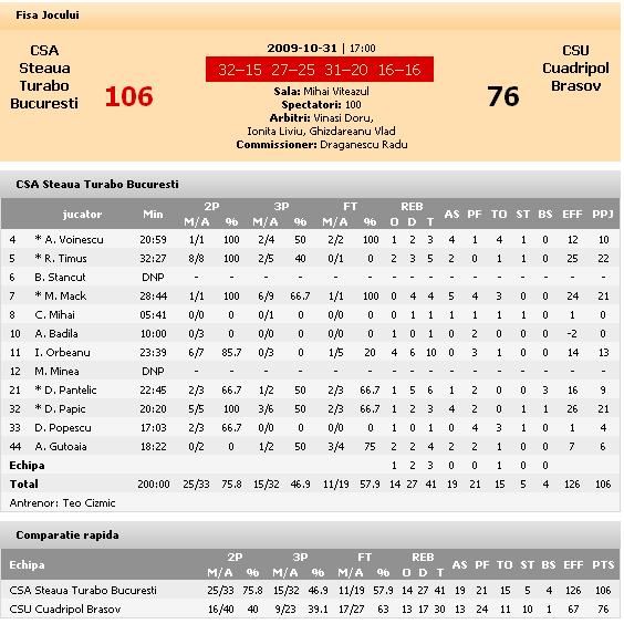 CSA Steaua Turabo - CSU Municipal Brasov 106-76 (32-15; 27-25; 31-20; 16-16)Etapa a saptea din liga nationala de baschet a adus o noua victorie pentru Steaua-Turabo. Echipa lui Teo Cizmic a zdrobit pe brasovenii de la CSU Municipal cu scorul de 106-76 intr-un meci foarte spectaculos, probabil cel mai spectaculos al etapei.4.Voinescu - 5.Timus -7.Mack - 21.Pantelic - 32.Papic Stelistii au inceput puternic, preluand conducerea jocului inca de la inceput si au castigat primele trei sferturi cu 32-15; 27-25; 31-16, ultimul sfert terminandu-se la egalitate 16-16. Americanii Stelei s-au dovedit a fi oameni decisivi, jucatori valorosi de care Steaua are nevoie in acest campionat. Acestia au facut spectacol, alley hoop-urile lor incantand publicul prezent la meci. Daca Ron Timus si-a facut prezenta simtita in joc inca din primul minut, Monty Mack, noua achizitie a Stelei, a aratat ce poate doar in a doua jumatate a meciului. Americanul de 32 de ani si 1,91 metri inaltime a venit la Steaua de la Selcuk Universitesi, din Turcia. Mack a avut in sezonul precedent medii de 14.9 puncte, 3.5 pase decisive si 2.2 recuperari in 32.1 minute petrecute in medie pe meci. Americanul are o experienta bogata, avand la activ multe sezoane in campionate ca cel al Italiei, Belgiei sau Cehiei. Dupa un inceput de meci mai slab, Mack si-a intrat in mana in sfertul al treilea si a aratat publicului ca e un maestru al aruncarilor de 3 puncte. Monty a reusit nu mai putin de 6 astfel de aruncari, din 9 incercari. Cei mai buni jucatori ai Stelei au fost Timus(22 puncte, 5 recuperari si 2 pase decisive), Mack(21 puncte, 4 recuperari, 5 pase decisive) si Papic(21 puncte, 3 recuperari si 4 pase decisive) dar trebuie scos in evidenta si tanarul jucator Iulian Orbeanu(20 de ani, 204 cm. inaltime). Acesta a reusit 13 puncte si 10 recuperari, fiind cel mai bun de pe teren la acest capitol. Steaua a castigat fara probleme meciul cu Brasovul si a rulat aproape tot lotul, Minea fiind singurul lasat pe banca. Inainte ca aceasta etapa sa ia sfarsit, Steaua ocupa locul 7, cu 10 puncte, cosaveraj 577 la 553. ![]() Adrian |